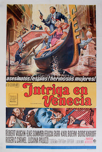 Top drawer Argentinian artwork here and one of the best "Man from Uncle" style film posters. The depth of colour and use of perspective is a marvel to behold. This 1966 film poster was printed by RAF Malabia and has great artwork of Robert Vaughn and Elke Sommer in the gondola on the streets of Venice as they some face to face with Italian espionage agents at a peace conference. Robert Vaughn is painted holding the classic hand gun with silencer which was his go to in the Man from U.N.C.L.E. series. A superb piece of MGM cinema history.
