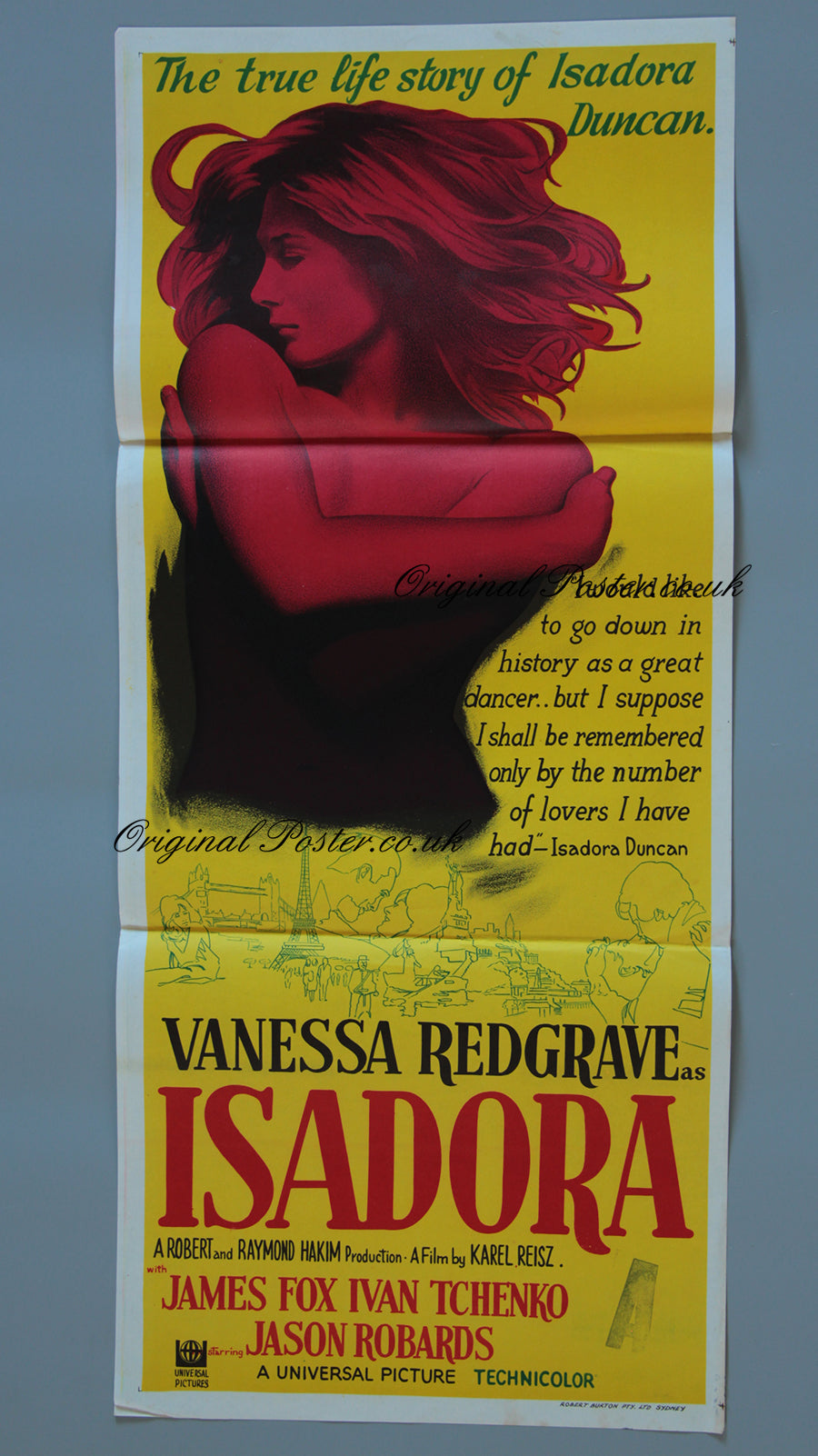 Sensual artwork picturing Vanessa Redgrave in the portrayal of the true life story of Isadora Duncan the much travelled dancer very influential in the Jazz age. This Australian daybill film poster was printed by Robert Burton of Sydney and purchased by us directly from a New Zealand cinema with a certification stamp at the lower right. The film poster has the benefit of fine pen & ink illustration of scenes in London, Paris and America and comes in folded condition as supplied to the cinema with no pinholes.