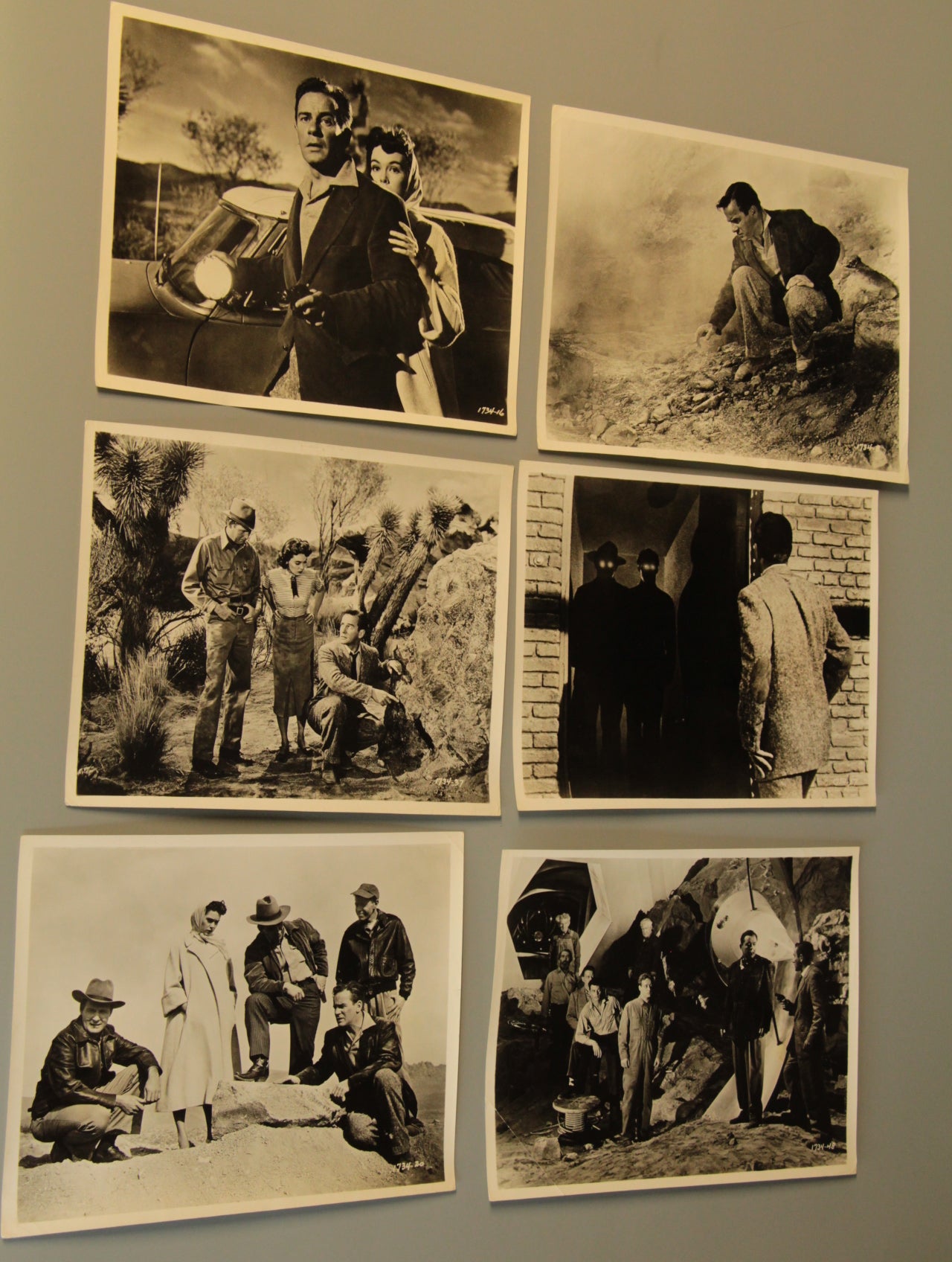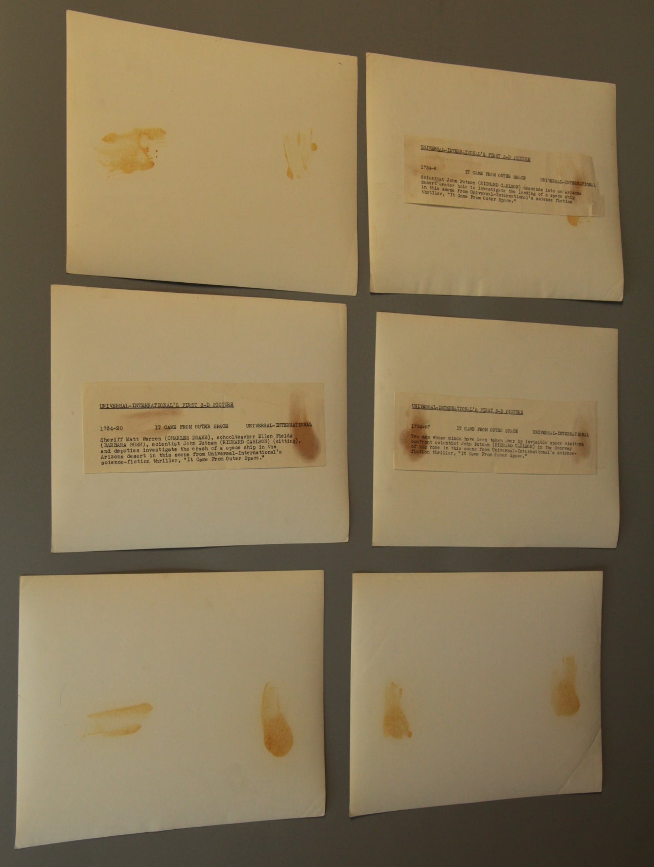 This early 3-D classic Science Fiction 1953 film was filmed in black and white and in 3D becoming the first of many great Science Fiction films from Director Jack Arnold. These terrific Universal Pictures 6 British cinema stills picture scenes from the film as aliens arrive in the Arizona desert adopting human identities while they repair their space ship. Astronomer Richard Carlson sees it all happen - if only he could find someone to believe him. These rare British stills have key scenes from Universal Pictures first 3-D film with three of the cards having a full synopsis attached to the reverse, one being the investigation of the crash of a spaceship, another being scientist John Putnam (Richard Carlson) descending into a crater hole to investigate the landing of a space ship and another picturing two men whose minds ahem been taken over by invisible space visitors confronting scientist John Putnam in the doorway of his home. Great rare glossy stills with no pinholes.