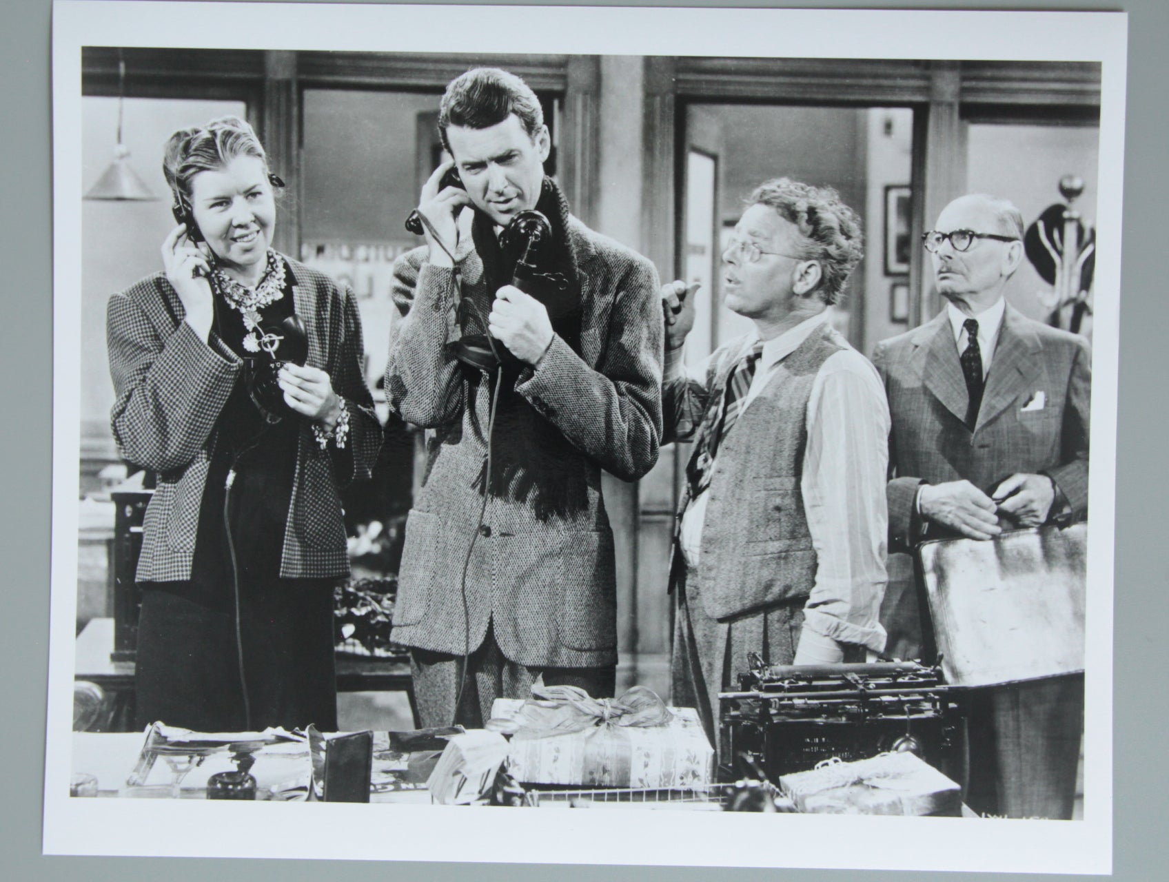 This is a press publicity cinema production still acquired by us directly from the Midlands Arts Cinema in Birmingham where it was used to promote the December the 5th 1997 50th Anniversary showing of Frank Capra's "It's A Wonderful Life". James Stewart is pictured on the telephone with Christmas presents visible in the foreground from this wonderful film directed by Frank Capra. This glossy still is in great condition and with no pinholes.