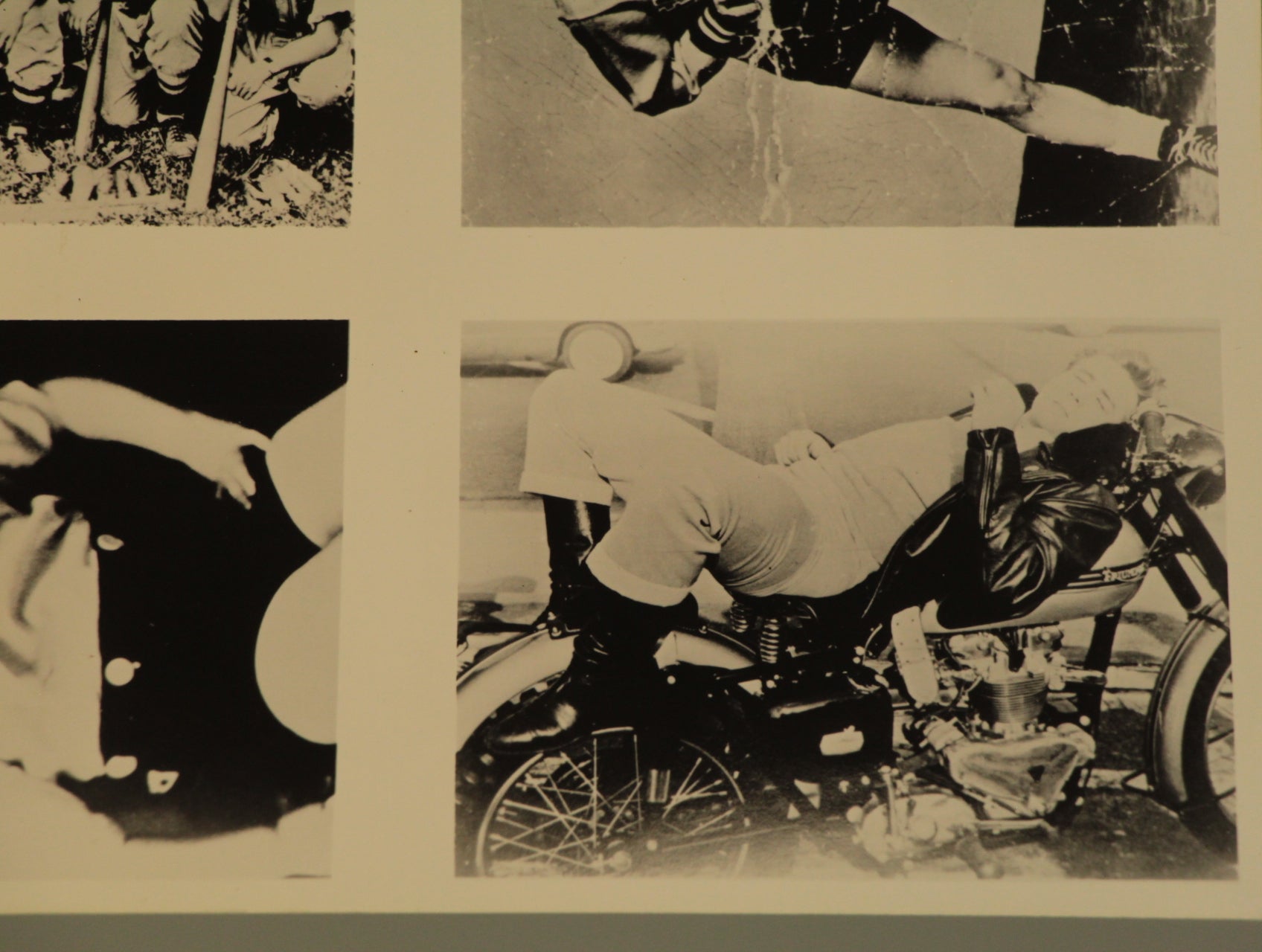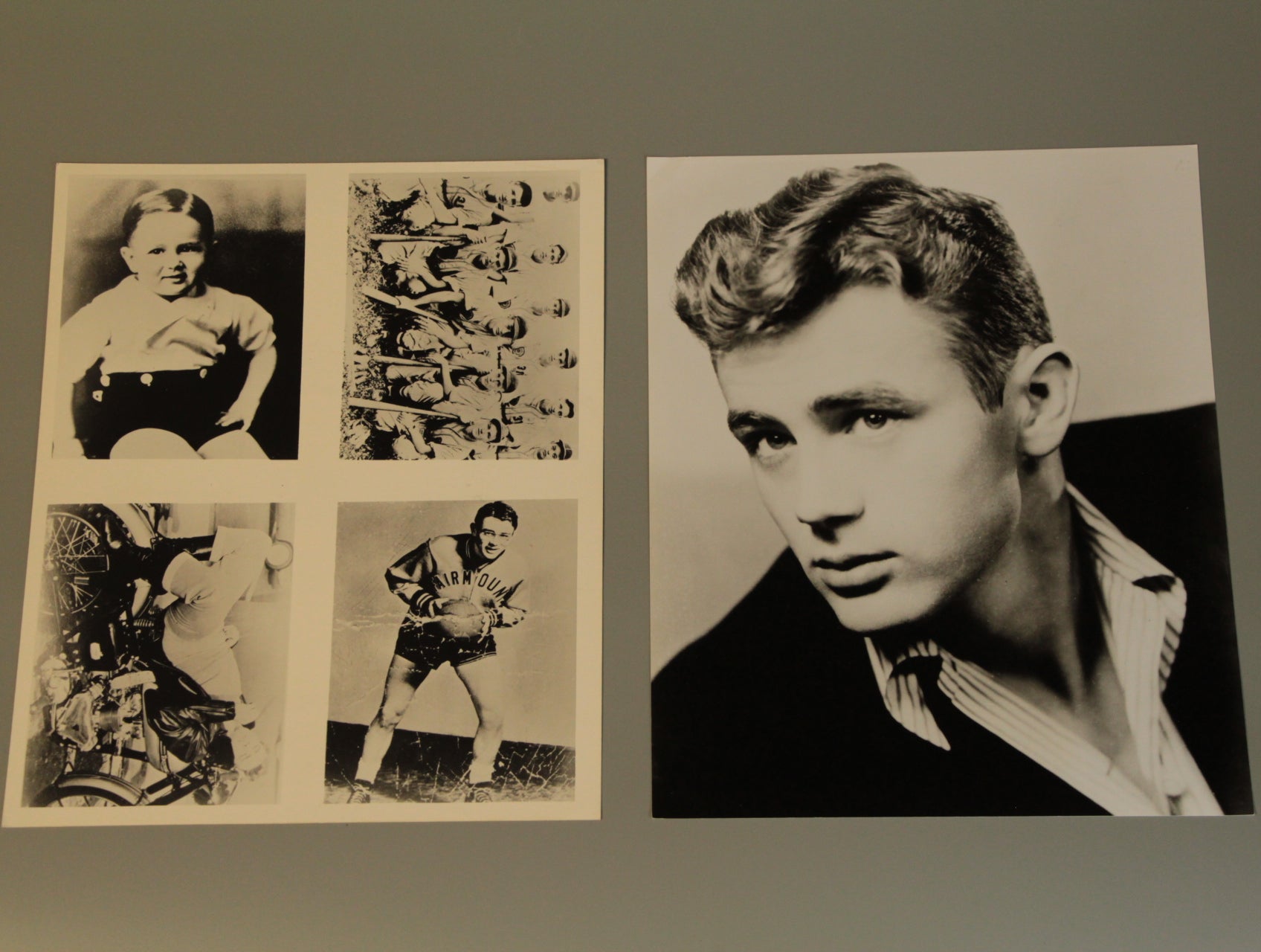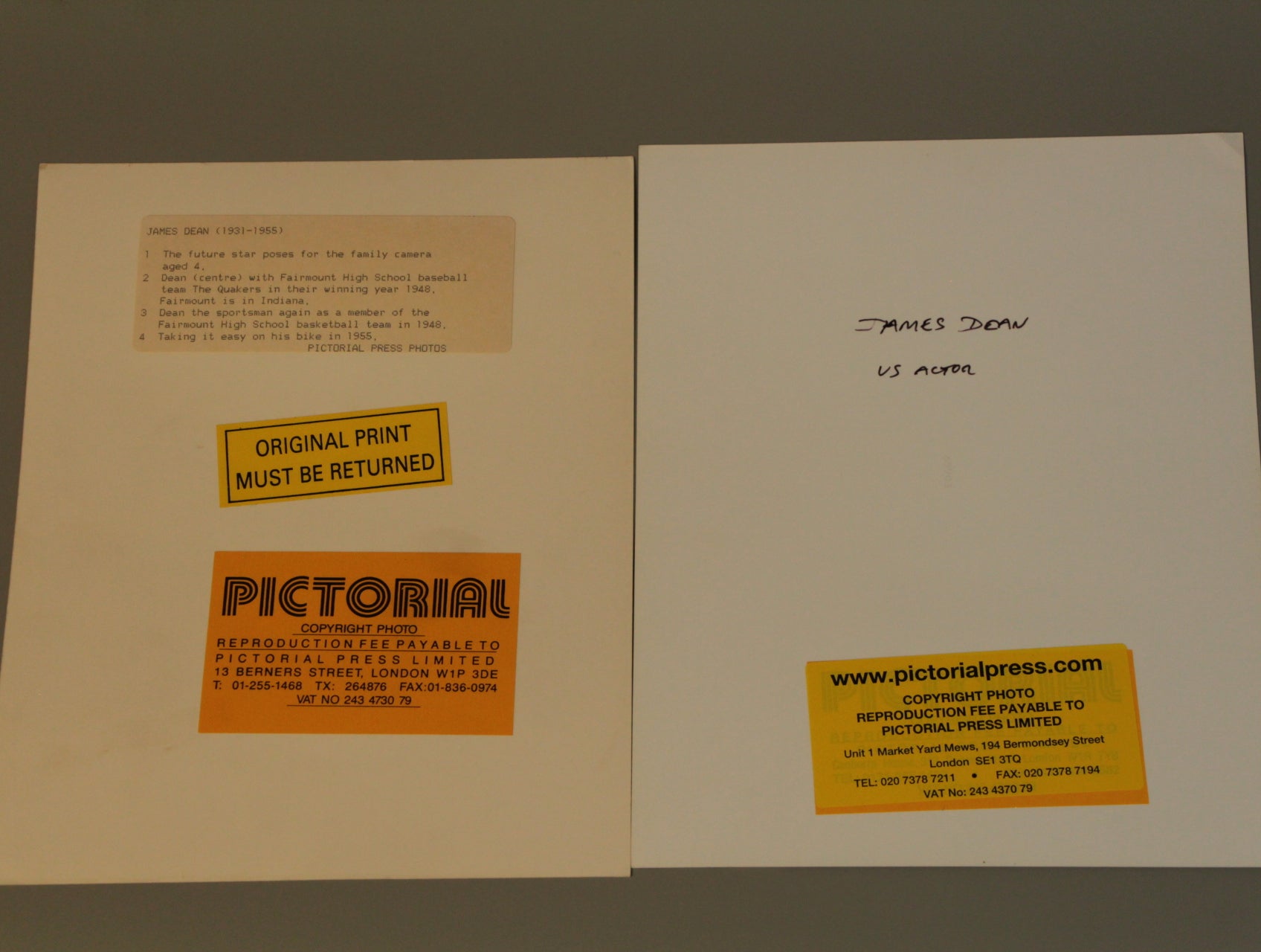 Superb original print photos of James Dean (1931 - 1955). The photos picture James Dean taking it easy on his motorbike from 1955, another as a member of the Fairmont High basketball team in 1958, another from their winning year in 1948 and one from the family camera with James Dean aged 4. These photos were sent to the newspaper who would have had to have paid a fee in order to use them.