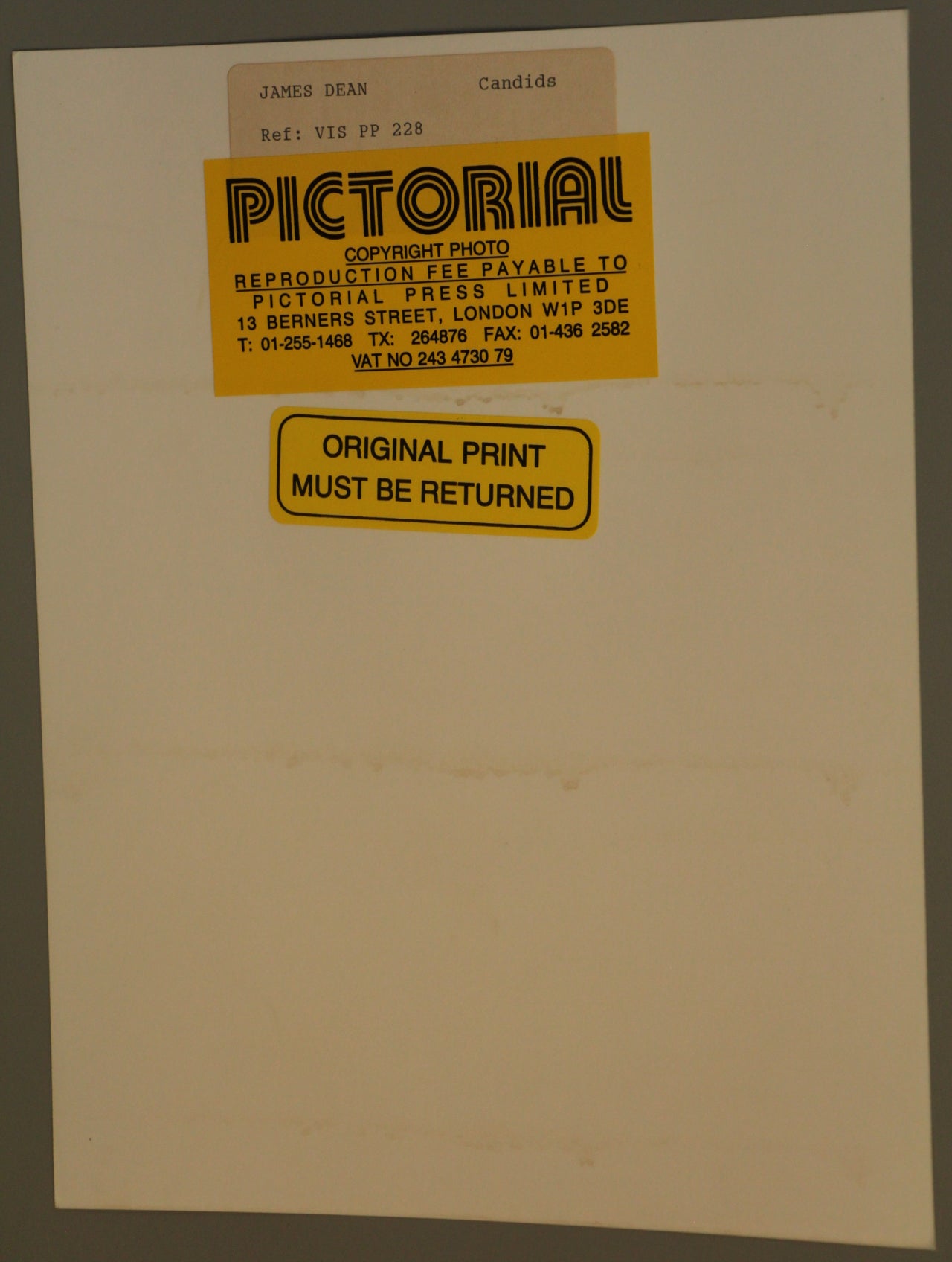 Superb original print photo of James Dean (1931 - 1955). The photo pictures James Dean in a candid pose and is a copyright photo from Pictorial Press Ltd of 13 Berners Street, London. This original print would have been sent to the newspaper who would have had to have paid a fee in order to use the photo and then they would have had to return it afterwards, the labels are attached to the reverse of the photos with no pinholes.