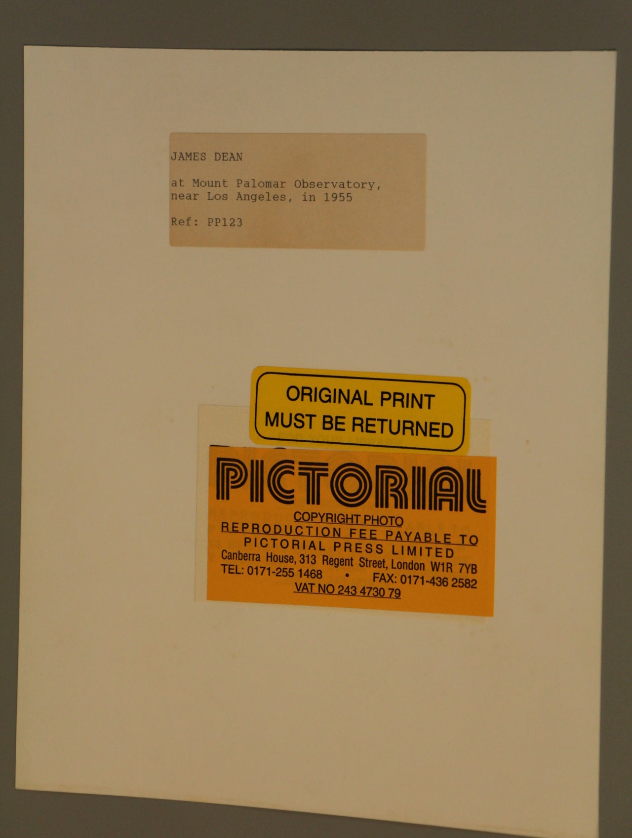 Superb original print photo of James Dean (1931 - 1955). The photo pictures James Dean at Mount Palomar observatory near Los Angeles in 1955. This original print would have been sent to the newspaper who would have had to have paid a fee in order to use the photo and then they would have had to return it afterwards, the labels are attached to the reverse of the photos with no pinholes.