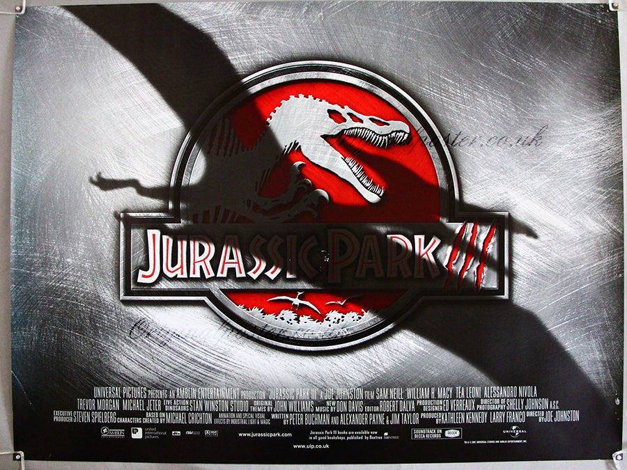 Original double-sided rolled film poster for "Jurassic Park III" with great textured look and menacing shadow of the pterodactyl.