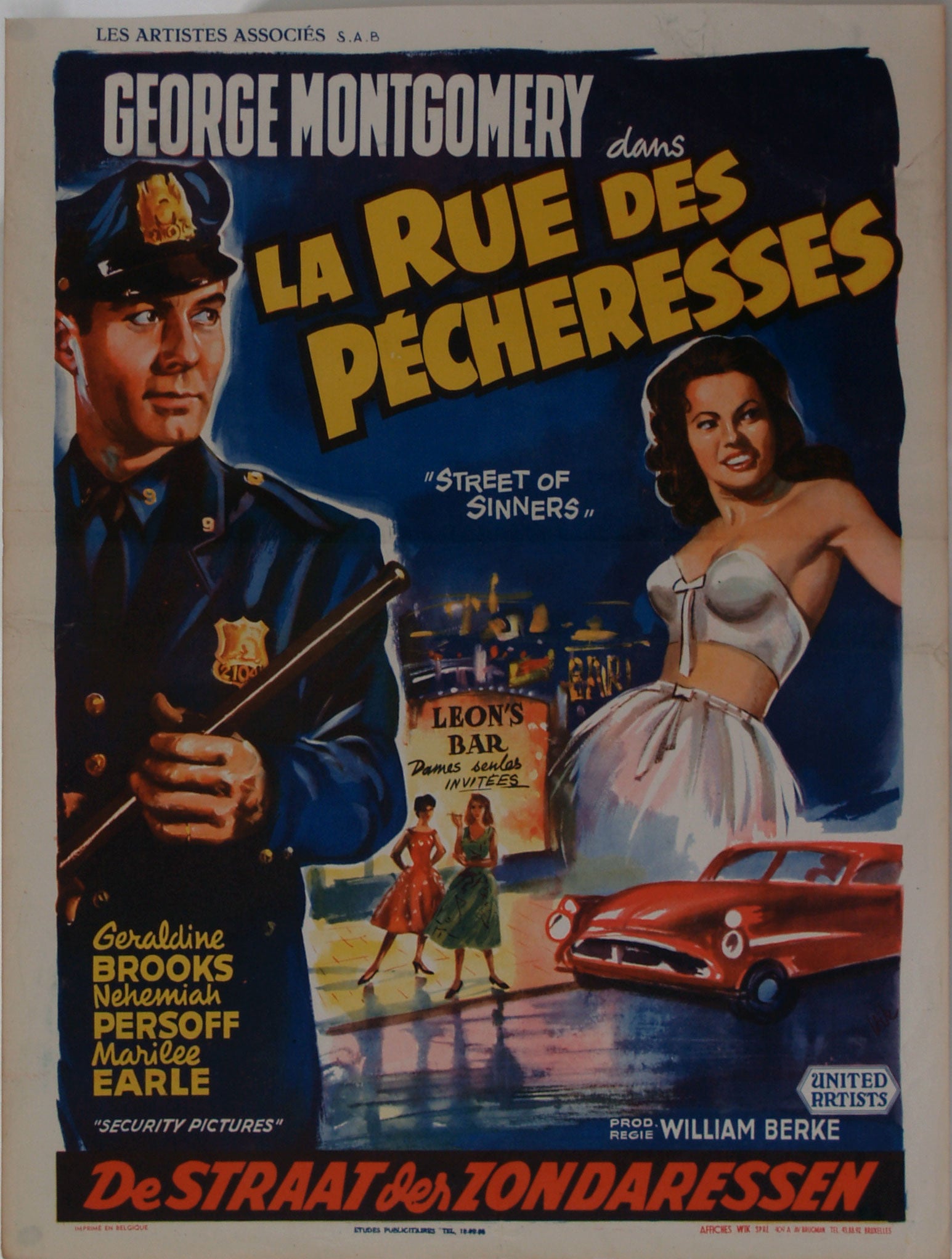 This 1957 film Noir film poster portrays George Montgomery in the role of the unlucky New York policeman with the job of enforcing the law in the "Street of Sinners". The film poster depicts a sleazy New York street scene and he has his truncheon raised in readiness. Great colours on this atmospheric Belgian Film Noir film poster.
