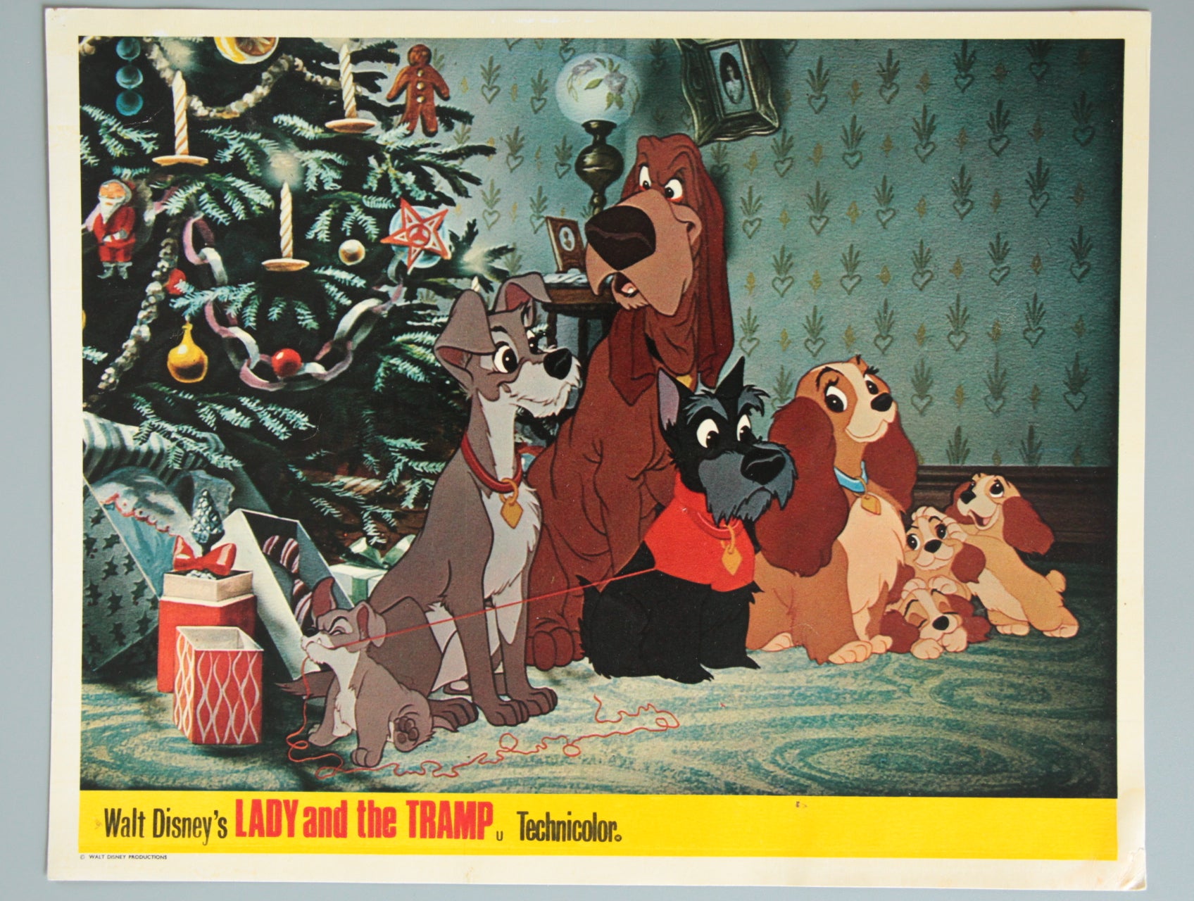 Walt Disney front of house cinema lobby card for the film "Lady & the Tramp". This card came from a British cinema where it was used for display purposes in the foyer during the run of the film at the cinema in 1963. Disney used Techincolor for the first time for this film and this card is in full colour with no fading. The Christmas scene complete with decorated tree features the proud parents Lady and the Tramp with their four pups with Trusty looking on as Tramp's son is slowly unthreading Jock's Christmas jumper as he is entirely oblivious to the goings on! Lovely scene with the pups playing and the presents under the tree. Great colours with no pinholes.