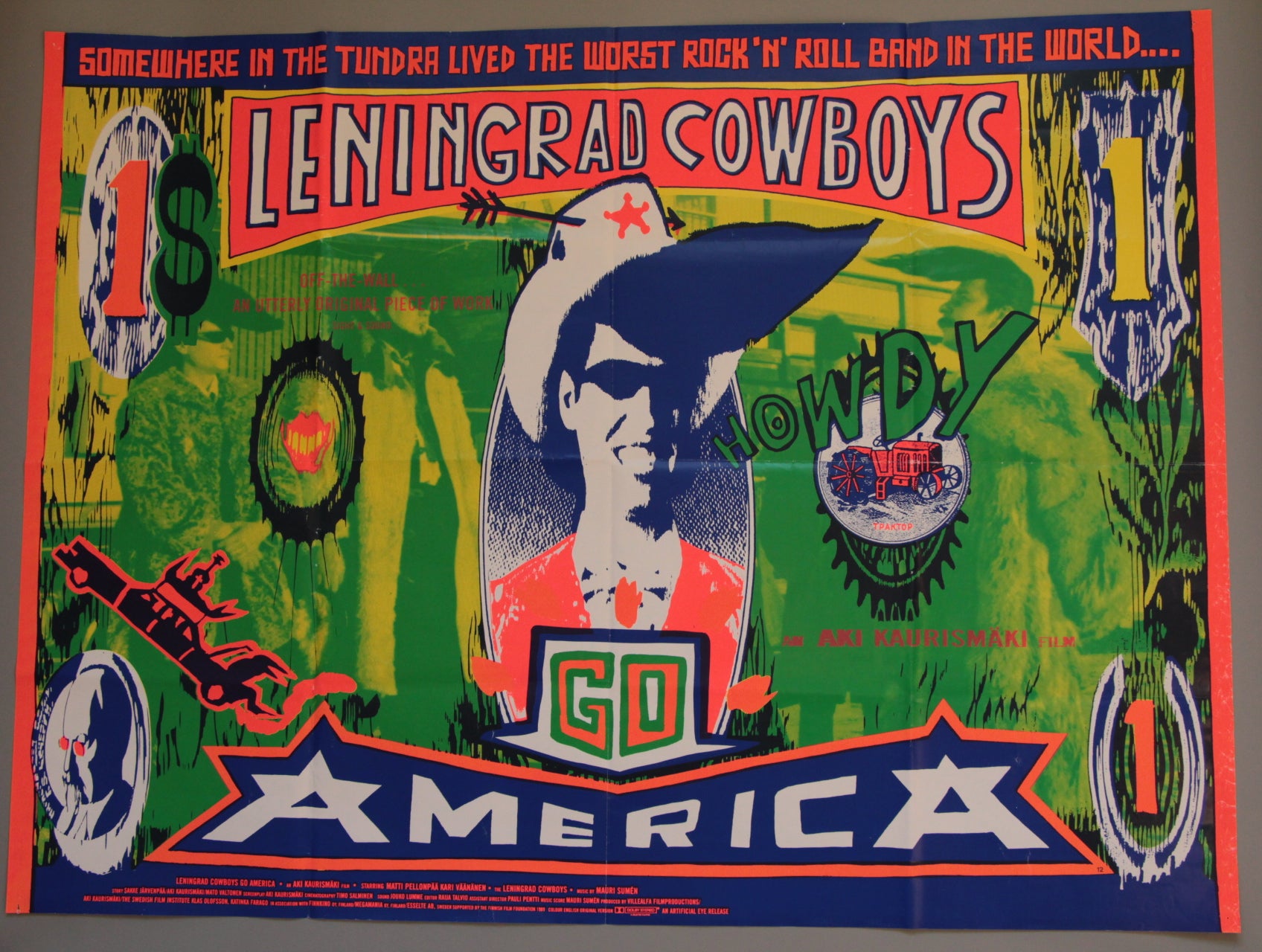 This is the 1989 British quad film poster for the celebrated film "Leningrad Cowboys Go America" from the Finnish director Aki Kaurismaki. This is very much an arthouse film poster and with fantastic colours paying tribute to rock bands and having been purchased by us directly from an arthouse cinema in Birmingham. The tory of the film is a road movie portraying the antics of the cowboy rock band doing their best to withhold their reputation as the World's Worst Rock band. They travel with their dead bassist complete with coffin in a Cadillac full of empty beer cans as they perform dreadful gigs in many States of America before finally lurching into Mexico. This Pop Art style artwork on this Artificial Eye film poster cleverly resembles a $1 bill and is in folded condition with just a pinholes in each corner and the title written on the reverse which doesn't not show through to the front.