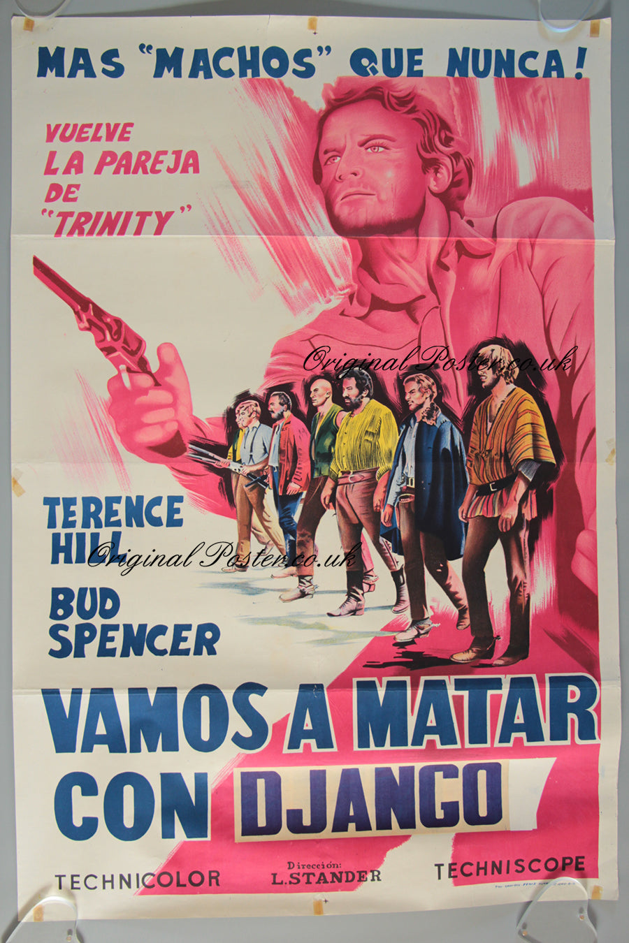 Argentinean film poster picturing Terence Hill and Bud Spencer in "Let's Kill With Django Hill" with a vibrant portrait of Terence Hill and printing by Fenix. Old tape marks in the corners as seen.