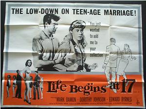 This original British quad film poster dates from 1958 for the Columbia pictures film "Life begins at 17". The fantastic photo at the lower left portrays five teenage girls with very short mini skirts - and this was before the swinging sixties. Teenagers were obviously deemed to be a problem in the 50s and the girl pictured here seems ready for a fight. "Teen-Age Marriage" seems to be an issue too according to the film poster. Although we must confess we have little experience in these matters and have not had the benefit of seeing this film. Great film poster from the 1950's.