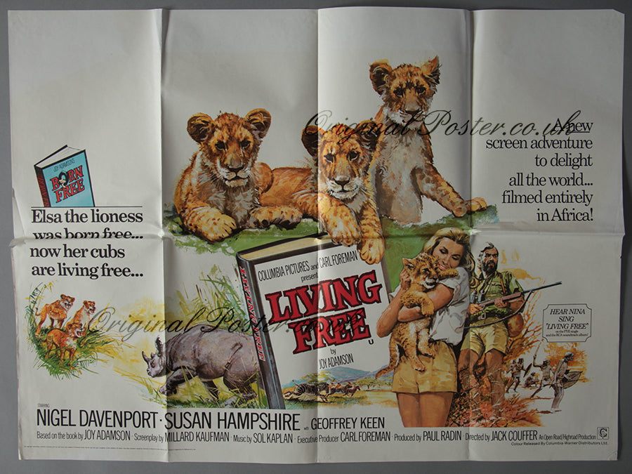 Cute lion cub artwork in this British quad film poster tracing the lives of Elsa's three cubs following "Born Free". Folded film poster.