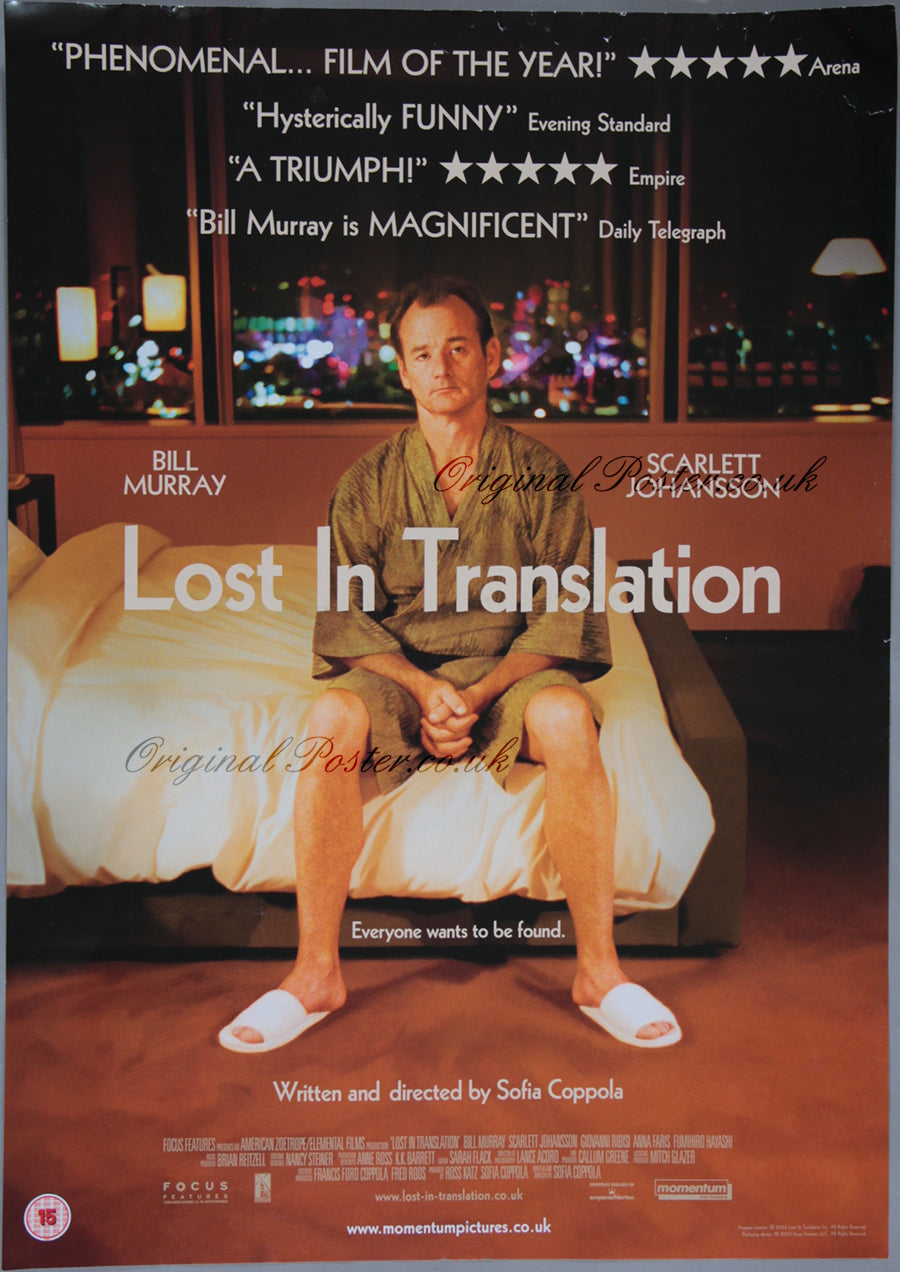 Original rolled condition video poster for the Sofia Coppola film "Lost in Translation" picturing Bill Murray and also starring Scarlett Johansson.