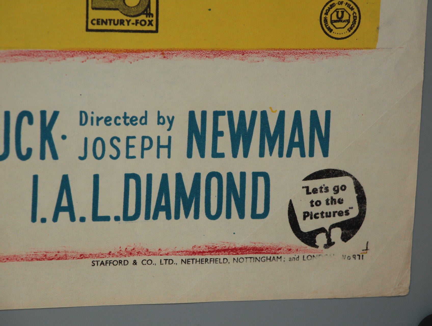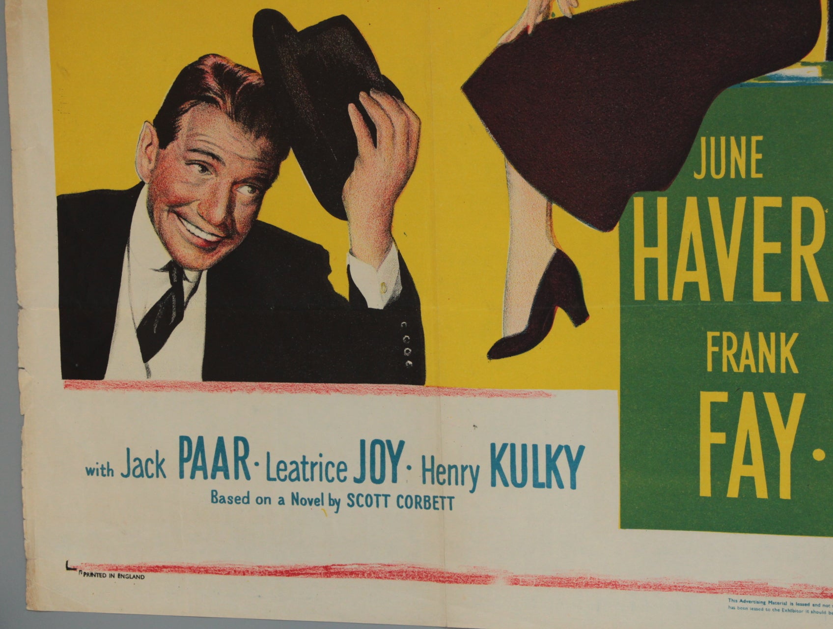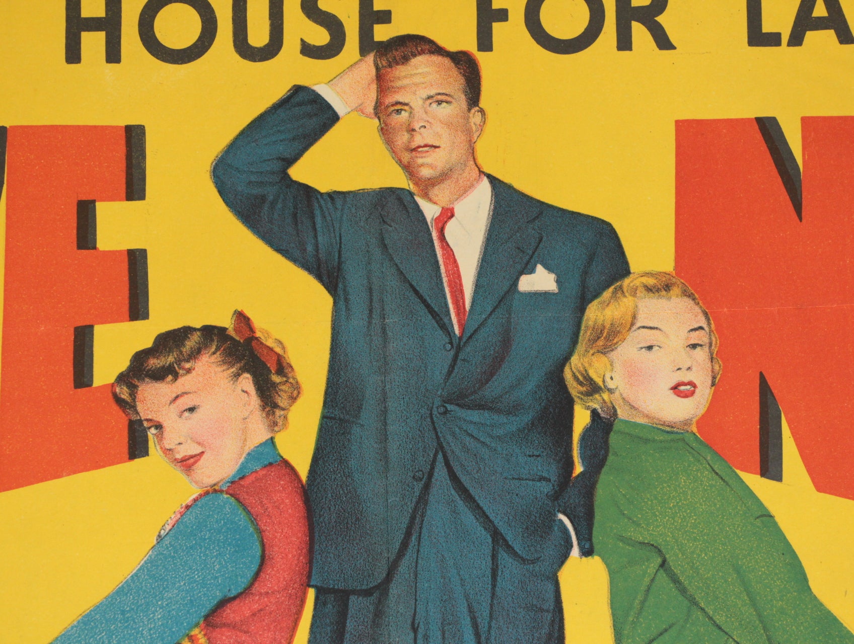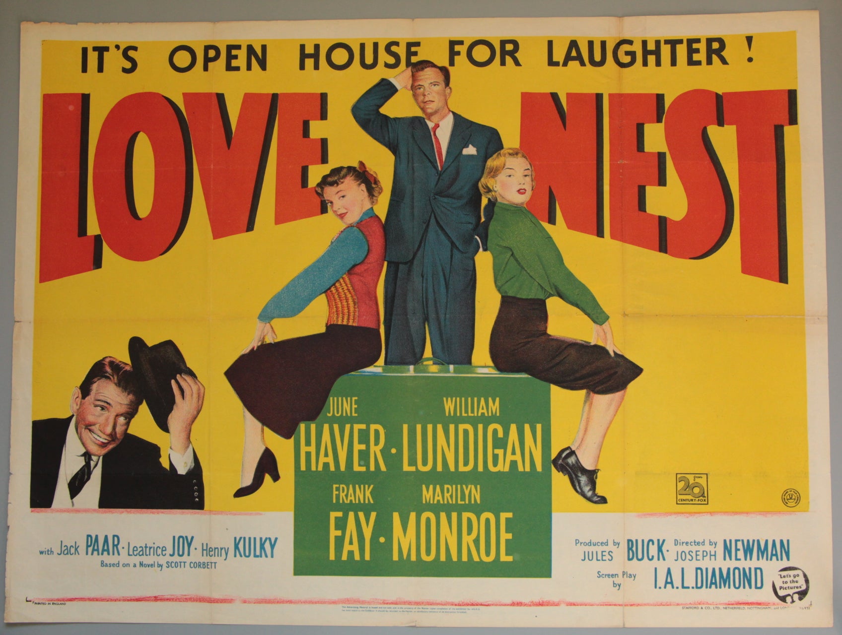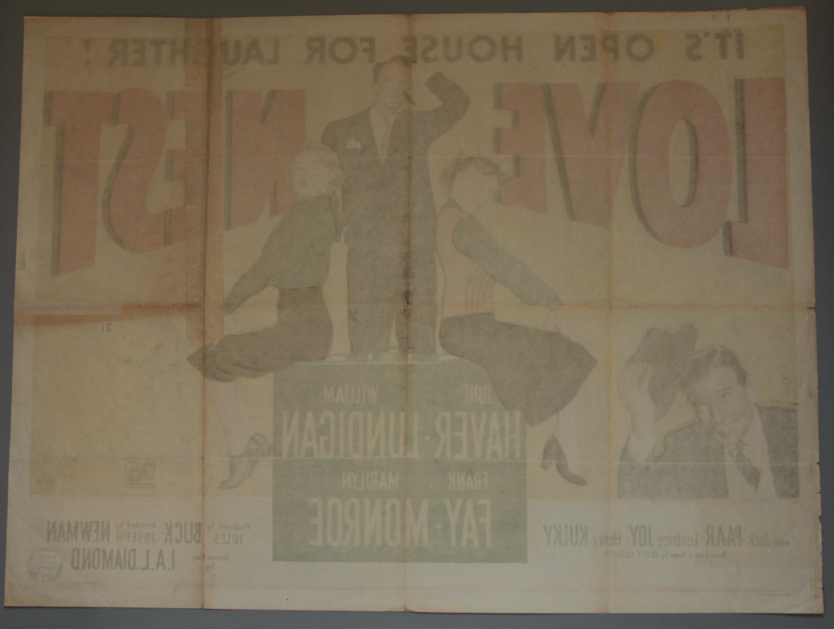 Marilyn Monroe is pictured with the young June Haver in full colour on this 1951 "Love Nest" British quad film poster before she became a big star. Marilyn Monroe was cast to introduce jealousy into the married relationship between June Haver and William Lundigan. A rare piece from a lesser known 1951 black and white film. Poster printed in England by Stafford & Co. Ltd., Netherfield, Nottingham and London No. 971. Folded condition with some tape reinforcement to the fold lines on the reverse plus edge wear to the left and top left corner.
