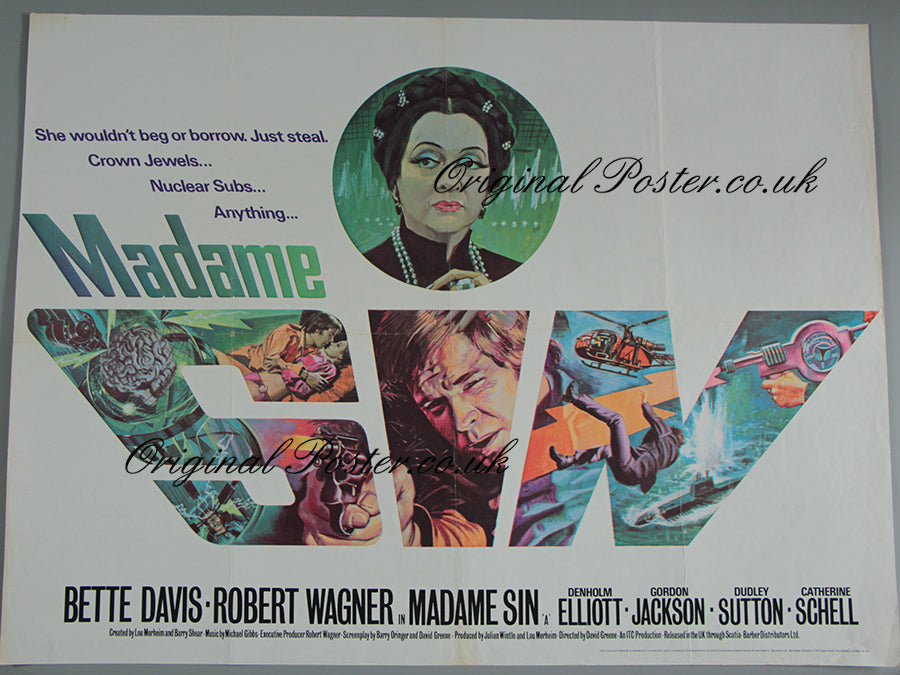 Great Chantrell art with Bette Davis superbly painted as "Madame Sin" and Robert Wagner with his blazing six-shooter and in the arms of Catherine Schell. Great Science Fiction painting with even the Polaris Nuclear Submarine. Folded condition film poster.