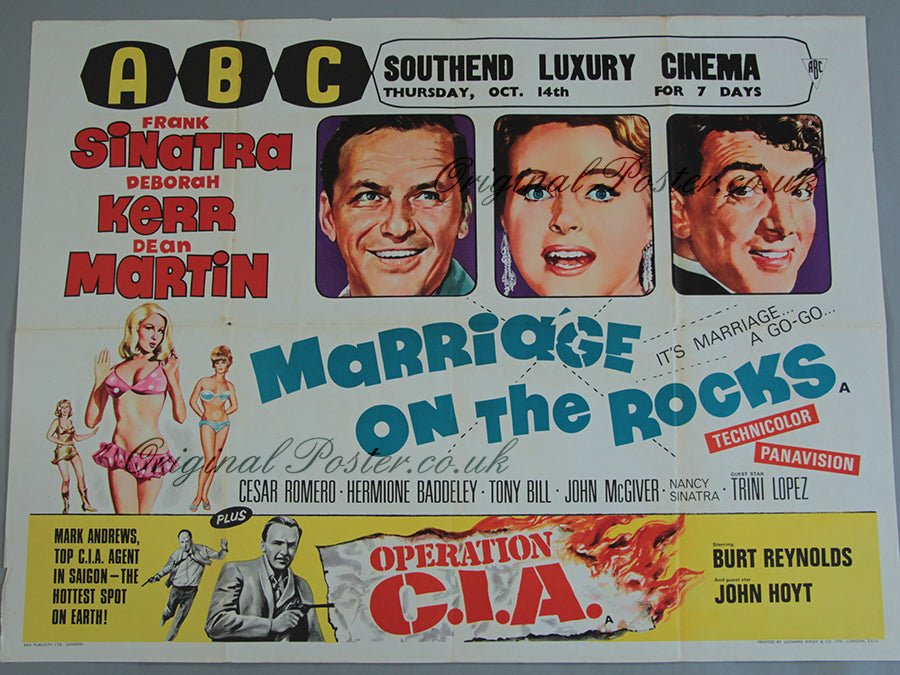 Super sixties artwork and starring Frank Sinatra, Deborah Kerr, Dean Martin, & Nancy Sinatra with special ABC printing from Rex publicity and Leonard Ripley & co showing at the Southend Luxury Cinema. Matchstick head sized fold line hole at the left centre fold as seen.