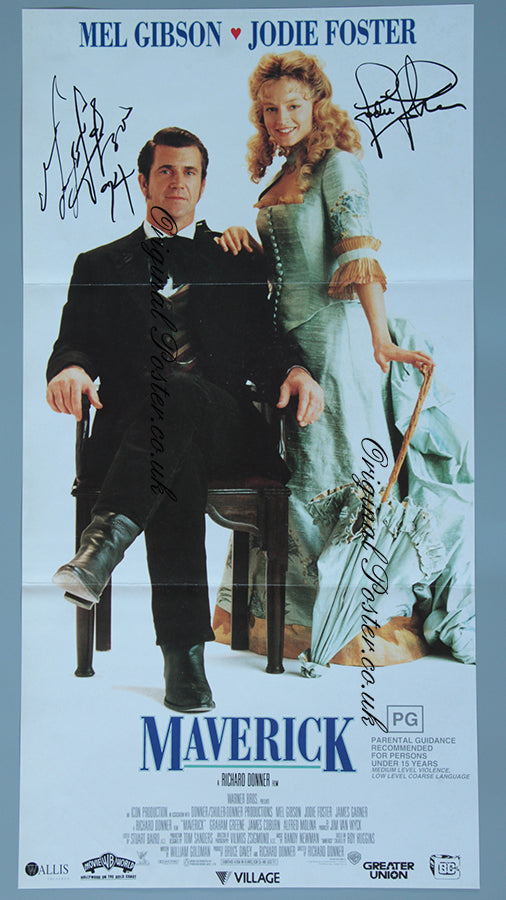 Mel Gibson is pictured as Brett Maverick the gambler and con artist who meets his match with Jodie Foster. James Garner also stars together with many fine western actors enjoying the poker table. This is the 1994 film poster complete with printed signatures of Mel Gibson and Jodie Foster.