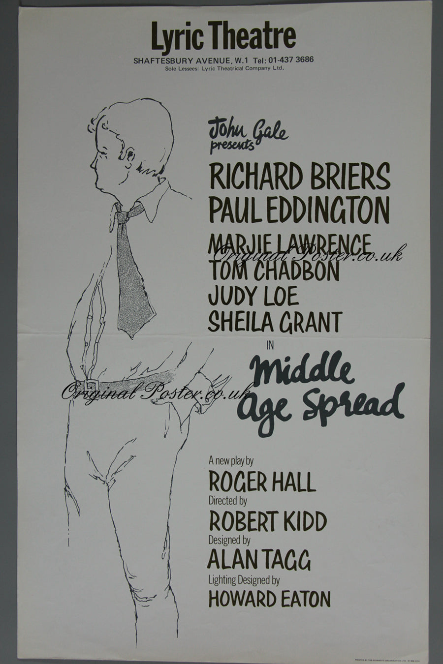 Original 1979 theatre playbill rolled condition poster for "Middle Age Spread" at the Lyric Theatre in Shaftsbury Avenue. Portrayed is a pen and ink drawing of Richard Briers sporting the aptly named middle age spread.