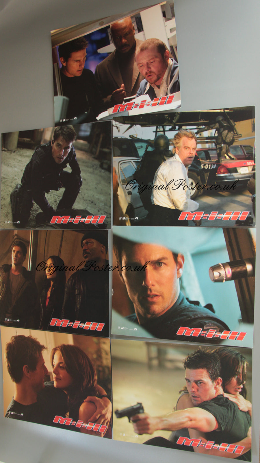 "Mission Impossible III" deluxe high quality printed original lobby cards picturing Tom Cruise in the third Mission Impossible film. Excellent condition cards with no pinholes.