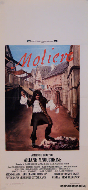 This 1979 Italian film poster for the film "Molière" was printed in Italy by Rotolitografica - Roma. Molière is pictured as the actor / playwright who disappeared in 1644 following his imprisonment for non-payment of debts.