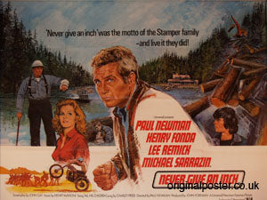 Stunning artwork for Paul Newman here who went on to direct this picture halfway through. English artist Brian Bysouth paints the British Quad film poster set in Oregon and picturing the Lumberjack way of life