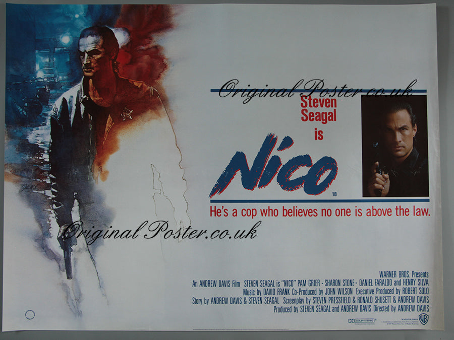 Interesting artwork from artist David Grove whose printed signature appears on the film poster for "Nico". The painting of Steven Seagal in the role of Nico Toscani the police man investigating a drugs heist with the shady background reinforced by the blues of the police force. The film poster also has the benefit of a photo of Steven Seagal who was better known at the time as a martial arts star. The F.B.I. take the case from Nico for dubious possibly criminal reasons. Great support is added by Pam Grier, Sharon Stone and Henry Silva in the role of the villain Zagon. This 1988 British quad film poster is in rolled condition.