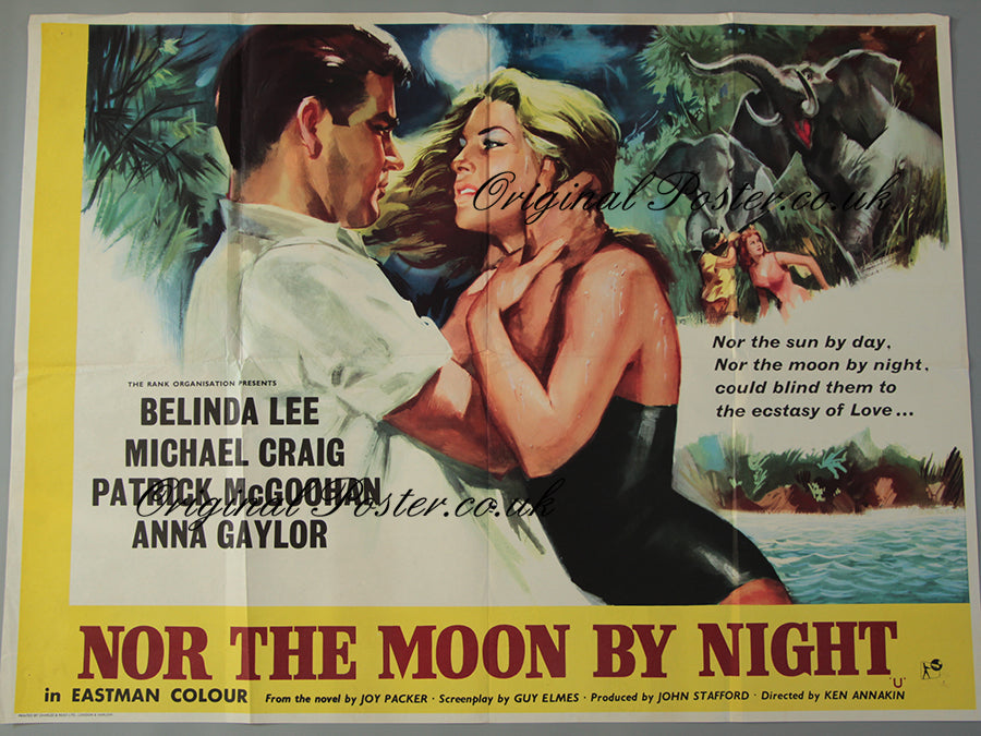 Great 1958 artwork by the renowned Italian artist Renato Fratini. The African elephants are painted at the top right in a hunting scene and the central image is of Belinda Lee and Michael Craig. Direction is by Ken Annakin with printing by Charles & Read Ltd. London & Harlow.