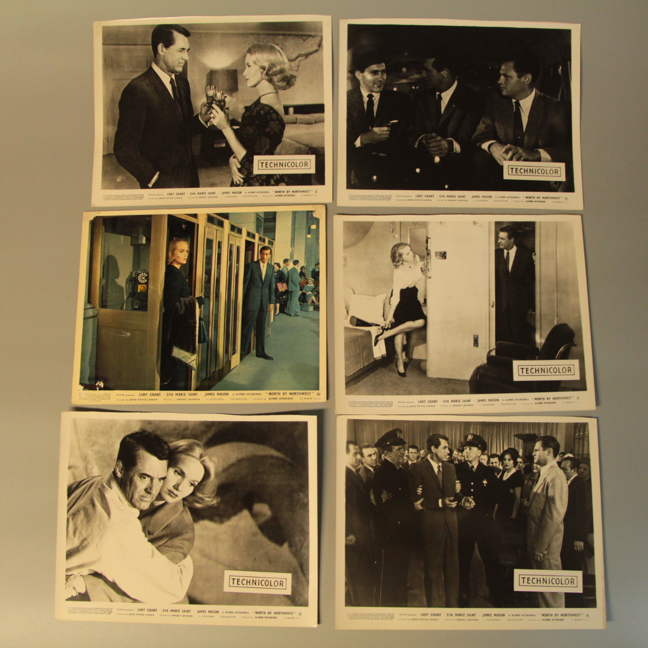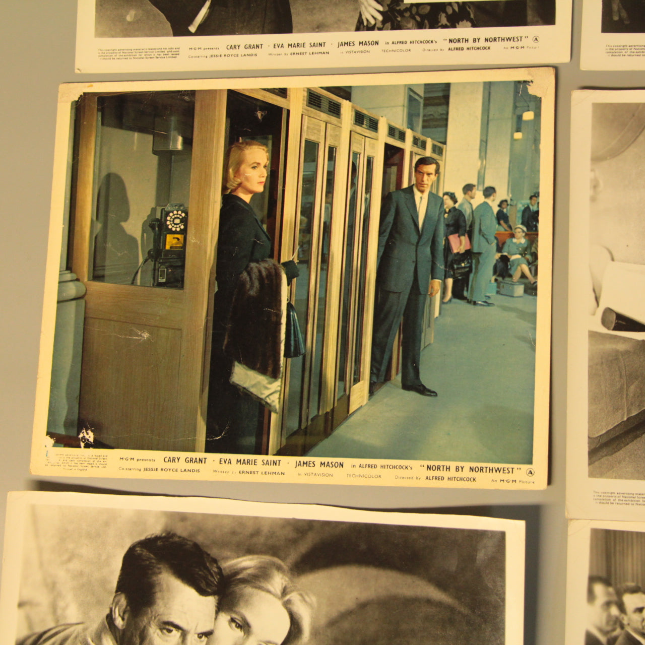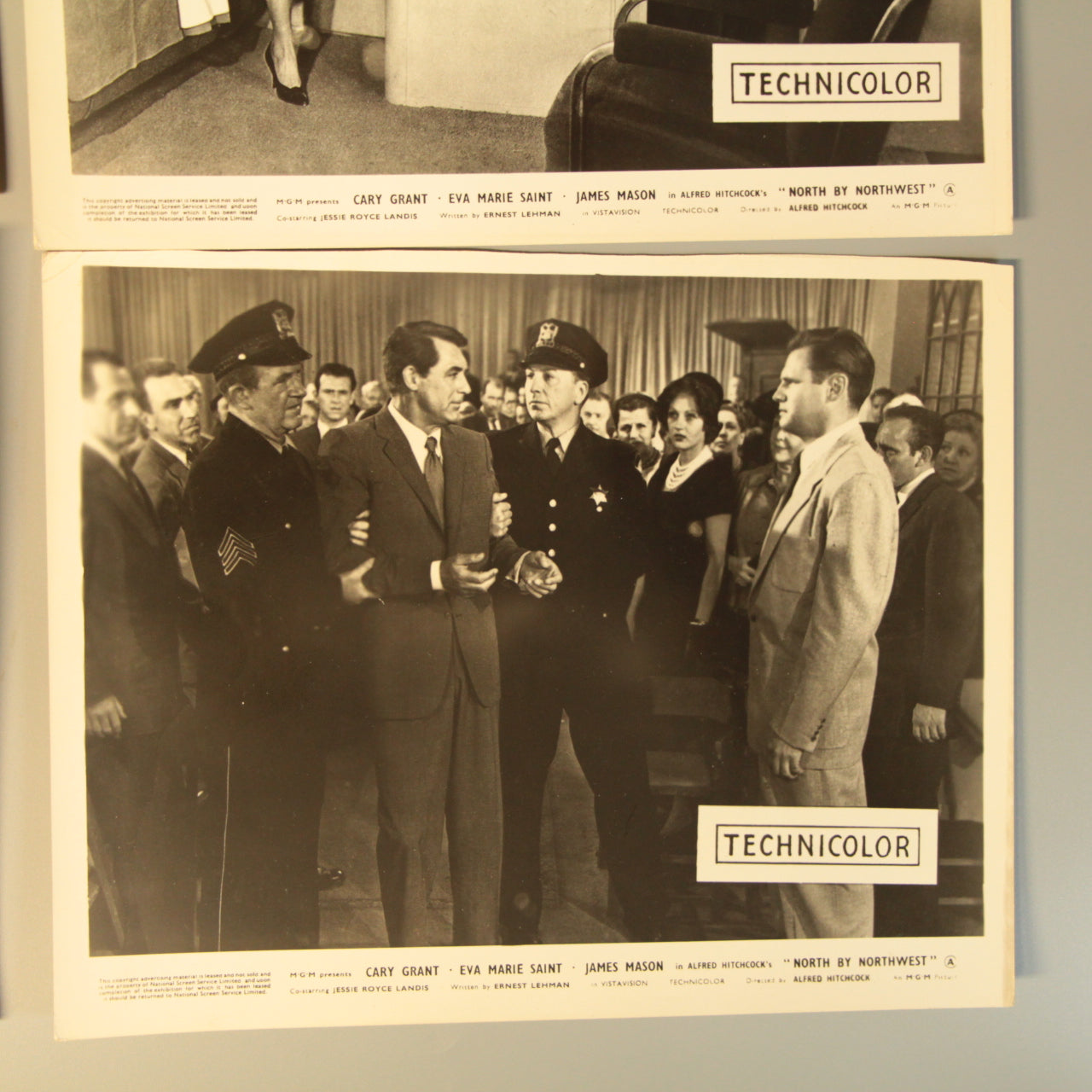 Six British front of house cinema lobby card stills for the Alfred Hitchcock classic spy thriller "North by Northwest" in 1959. Pictured are key scenes with the suave Cary Grant as Roger Thornhill together with Eva Marie Saint as Eve Kendall. Superb scenes pictured include the key scene at Grand Central Station, the embrace, and a classy scene where Eve is seen adjusting her high heels and another toast scene. Super stills with no pinholes, just a little paper lift in three corners of the colour card.