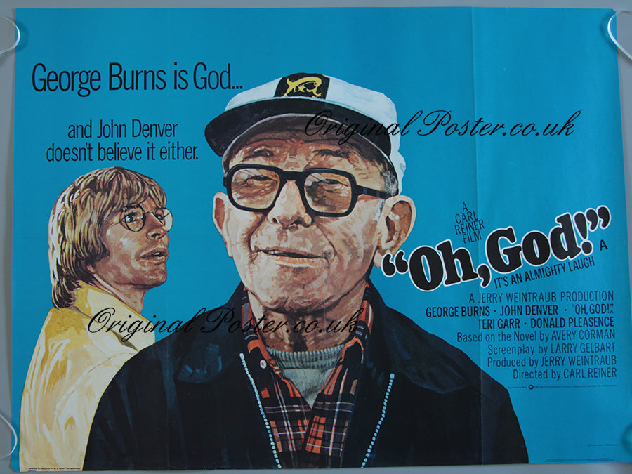 Printed in England by W. E. Berry Ltd. Bradford comes this wonderful Putzu artwork of George Burns and John Denver. The film poster is the first release British quad from 1977 where George Burns plays the Almighty who visits Earth looking for an assistant who turns out to be the supermarket assistant manager (Country singer John Denver). Very funny original film and the film poster in folded condition as supplied to the cinema.