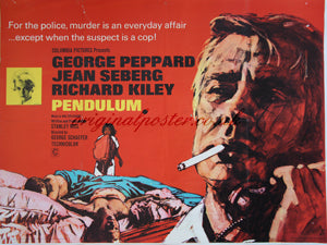 This British quad film poster for the Columbia pictures features very fast Italian artwork capturing the police officer George Peppard in frantic work day mode complete with telephone and cigarette. A fine photo of Jean Seberg is present too as is the murder scene. Printed in England by W. E. Berry Ltd. of Bradford, the 'X' certificate has been neatly felted over but still shows through. There is a 4 inch closed tear at the top border above the word 'murder'.