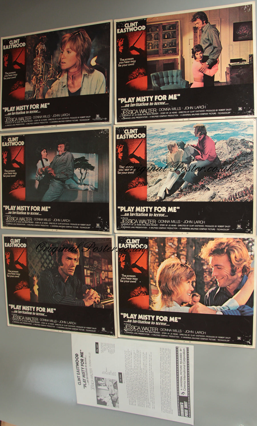 Six original 1971 "Play Misty For Me" US cinema lobby cards starring Clint Eastwood. This film marks Clint Eastwood's excellent directorial debut in which he plays a brilliant part as a Radio DJ who rejects Jessica Walter after a one night stand. The cards were acquired directly from a cinema in New Zealand and have the original R certificate stamp plus several pinholes in each corner where they were displayed in the cinema lobby. Included is an Exhibitor's press sheet picturing the day-bill design and an instruction to the cinema manager to invite local radio staff to see the film giving them a chance to discuss it on air.