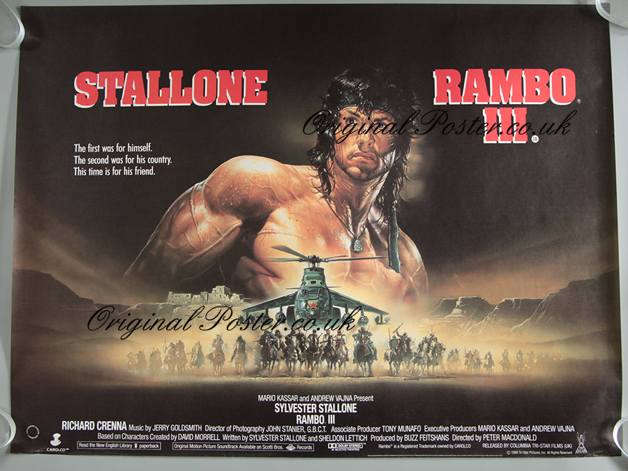 Rolled condition 1988 first release British quad cinema poster for "Rambo III" featuring the printed signature of the artist Renato Casaro who has painted a Russian helicopter below the portrait of Sylvester Stallone beneath the Afghan tribesman. Excellent rolled condition - no pinholes.