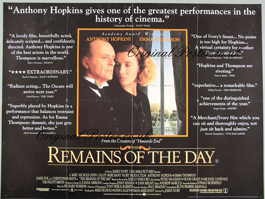"Remains of the Day" review style UK quad film poster in folded condition.