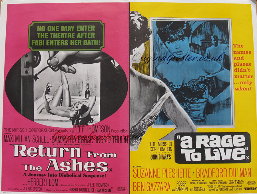 British cinema goers in 1965 would have to take their seats well before Samantha Eggar's bath time! She won best actress award for her performance as Fabianne at the Cannes Film Festival. The second "X" certificate film stars the pictured Suzanne Pleshette with just one of her admirers. Excellent 1965 "X" certificate double-bill film poster.
