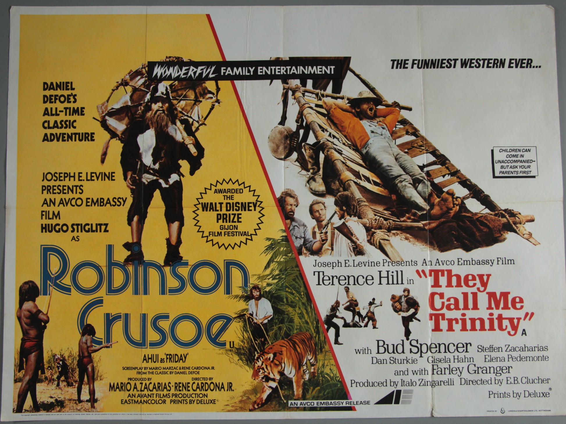 This wonderful 1970 film poster pictures the likeable Terrence Hill as Trinity with his buddy Bud Spencer in a really funny Spaghetti Western comedy "They call me Trinity". The two became International superstars and soared in popularity with many films to follow. The Family Fun here at the pictures included the Walt Disney film "Robinson Crusoe". The film poster was printed by Lonsdale & Bartholomew. Folded condition with no pinholes.
