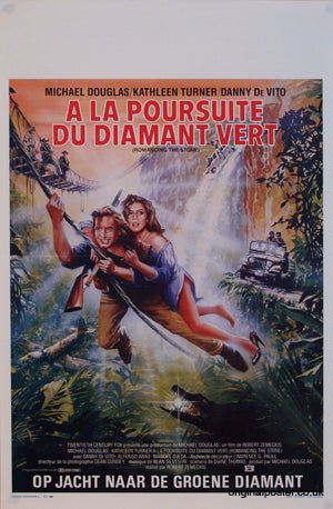 All action artwork with Cathleen Turner losing her high heel and the crocodile getting the diamond.