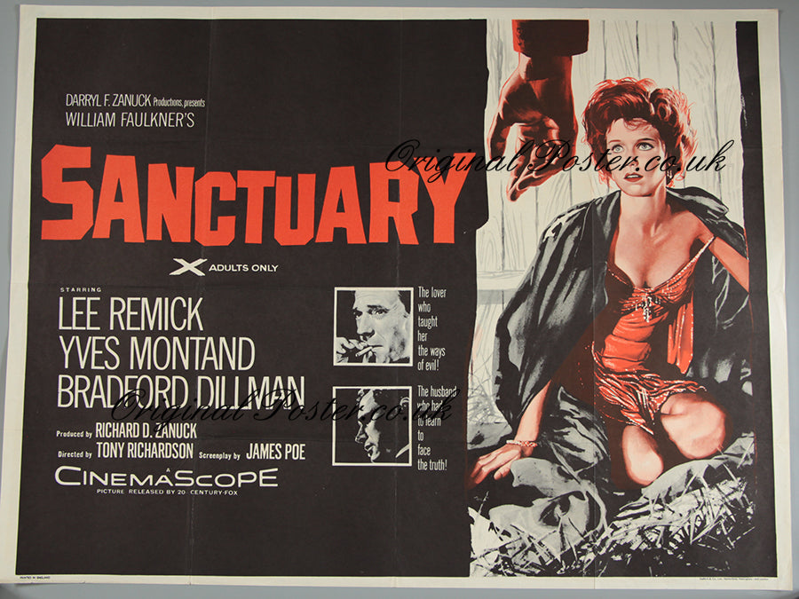 This is the 1961 British quad film poster for the X certificate film "Sanctuary". The film is from the novel by William Faulkner and was a CinemaScope film from 20th Century Fox and made in black and white. As was usual for the time cinema goers would be more than happy to see a colour poster and included here is some fine artwork together with two photos of the stars.