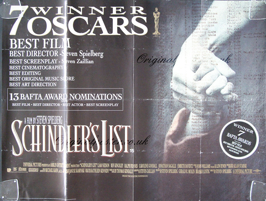 This moving double sided folded condition British quad film poster bears proudly the sticker denoting "Winner 7 Bafta Awards" and depicts the Oscar at the top of the poster together with "Schindler's List" layered over the supporting hands.