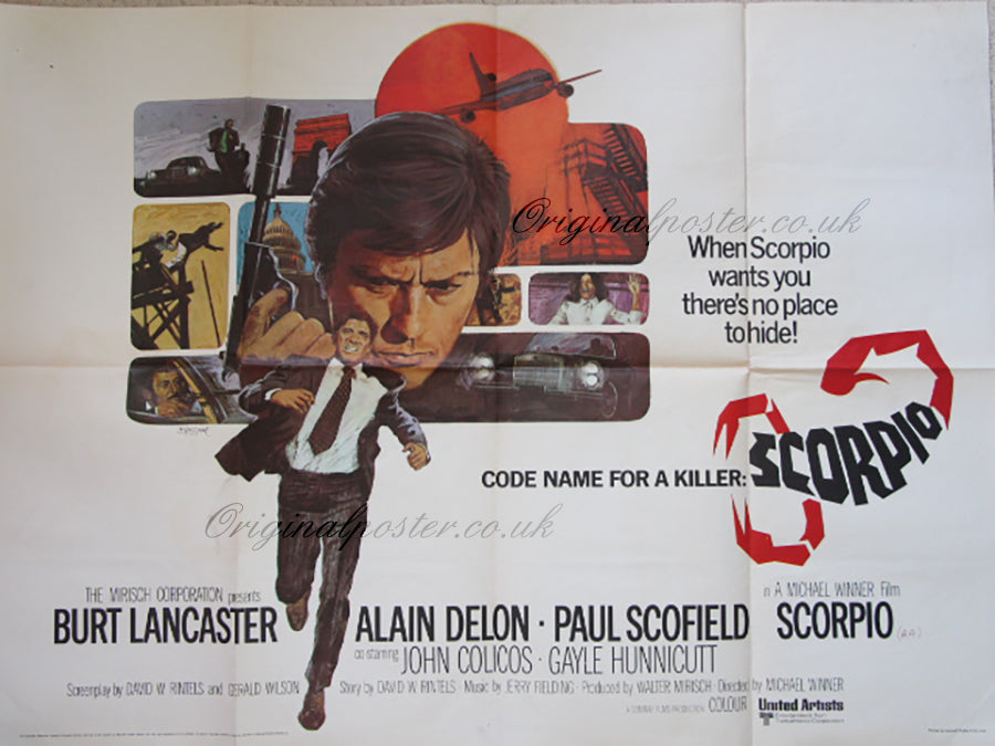 British quad film poster for the Spy thriller "Scorpio" from 1973 printed in England by Leonard Ripley & Co. Ltd. The artist Blossom printed signature appears on the poster with a portrait of Burt Lancaster who stars as the C.I.A. agent suspected of not being all he seems.