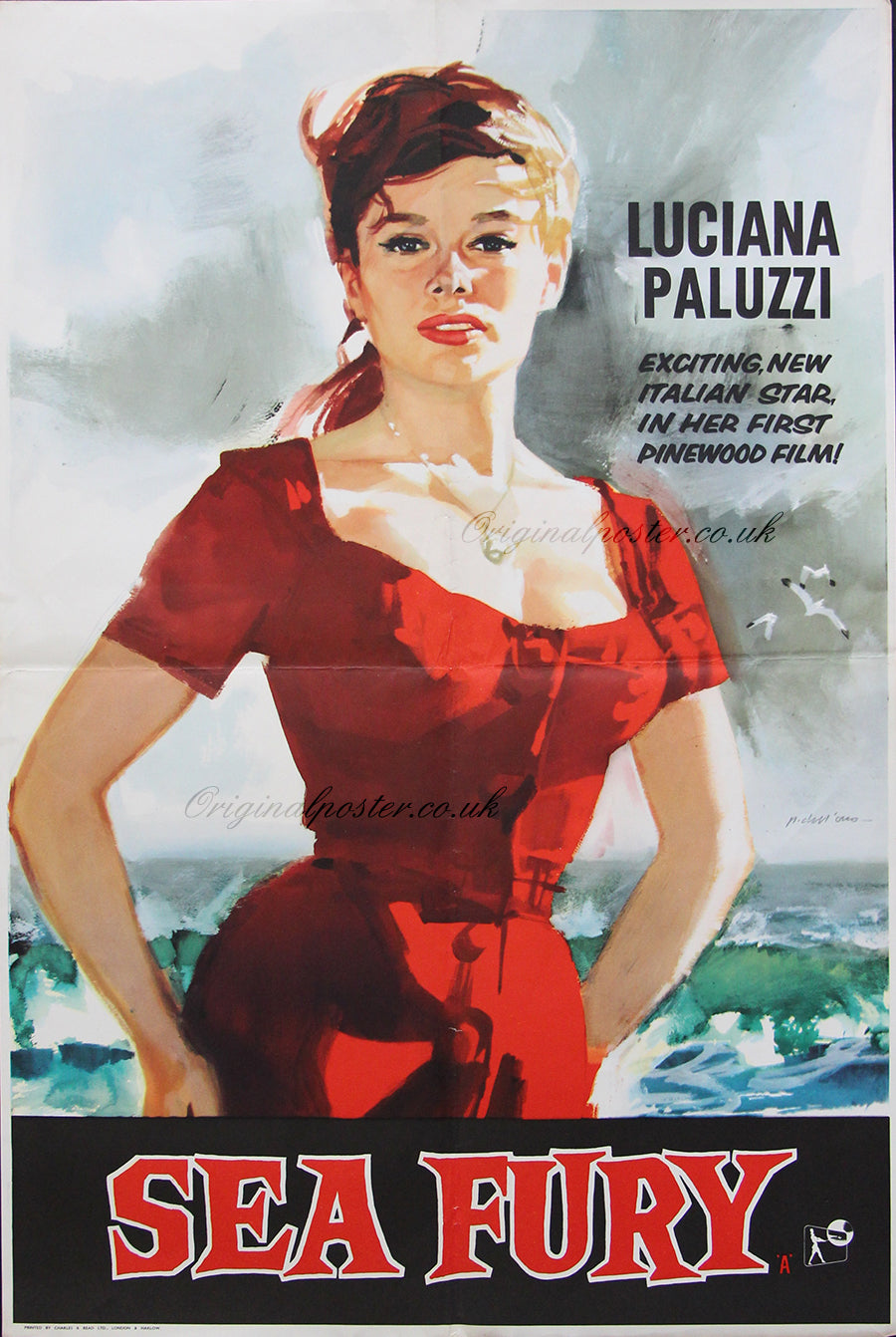 Stunning Italian painting of Luciana Paluzzi "Exciting new Italian star in her first Pinewood film!" This British double-crown is a stunning composition complete with the ocean and seagulls. Luciana Paluzzi is the local siren who Stanley Baker and Victor McLaglen compete for her attention. This is an interesting film poster as it features Italian artwork used by Rank films for use in the British market organised by the Downton agency in England run by Eric Pulford who supplied the reference material on his trips to Rome and employing many Italian artists who produced artwork with a freedom of expression completely different to British artists working at the time. This is a very early example of the success of this operation. Printed by Charles & Read Ltd. of London & Harlow. The film poster features the printed signature of artist Pino d'ell Orco.