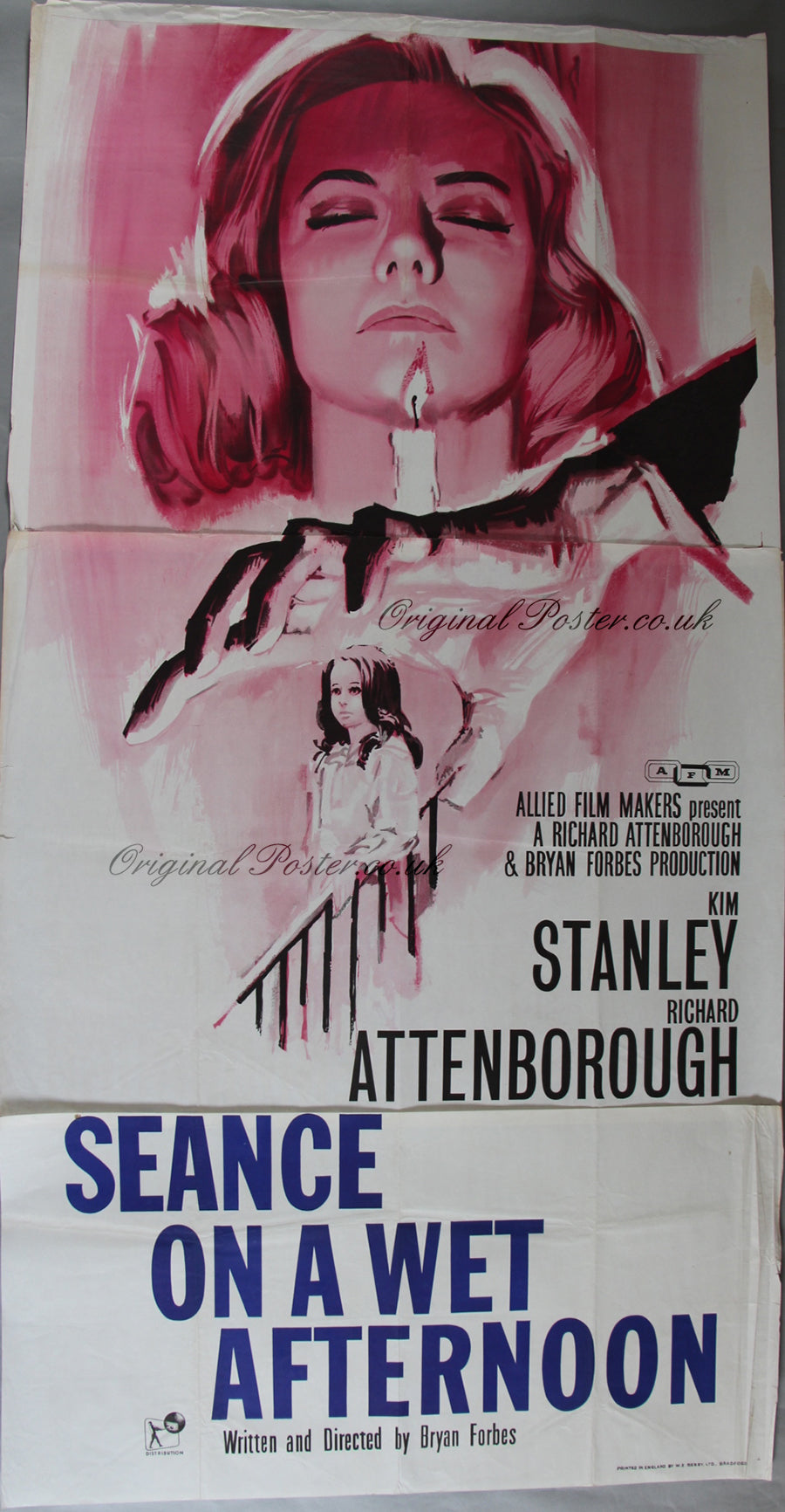 Director Bryan Forbes explores the world of the spirit medium here in 1964 with Kim Stanley, the Oscar nominated spiritualist who manipulates her Husband, played by Richard Attenborough, to kidnap a wealthy businessman's daughter in order for her to "find" the youngster in her pursuit of fame and celebrity status. Printed in England by W. E. Berry of Bradford this large paper film poster is a rare one and comes in two pieces.