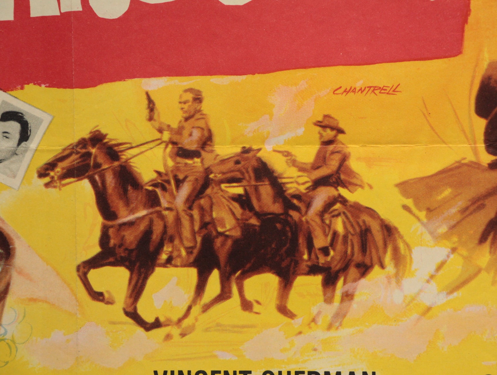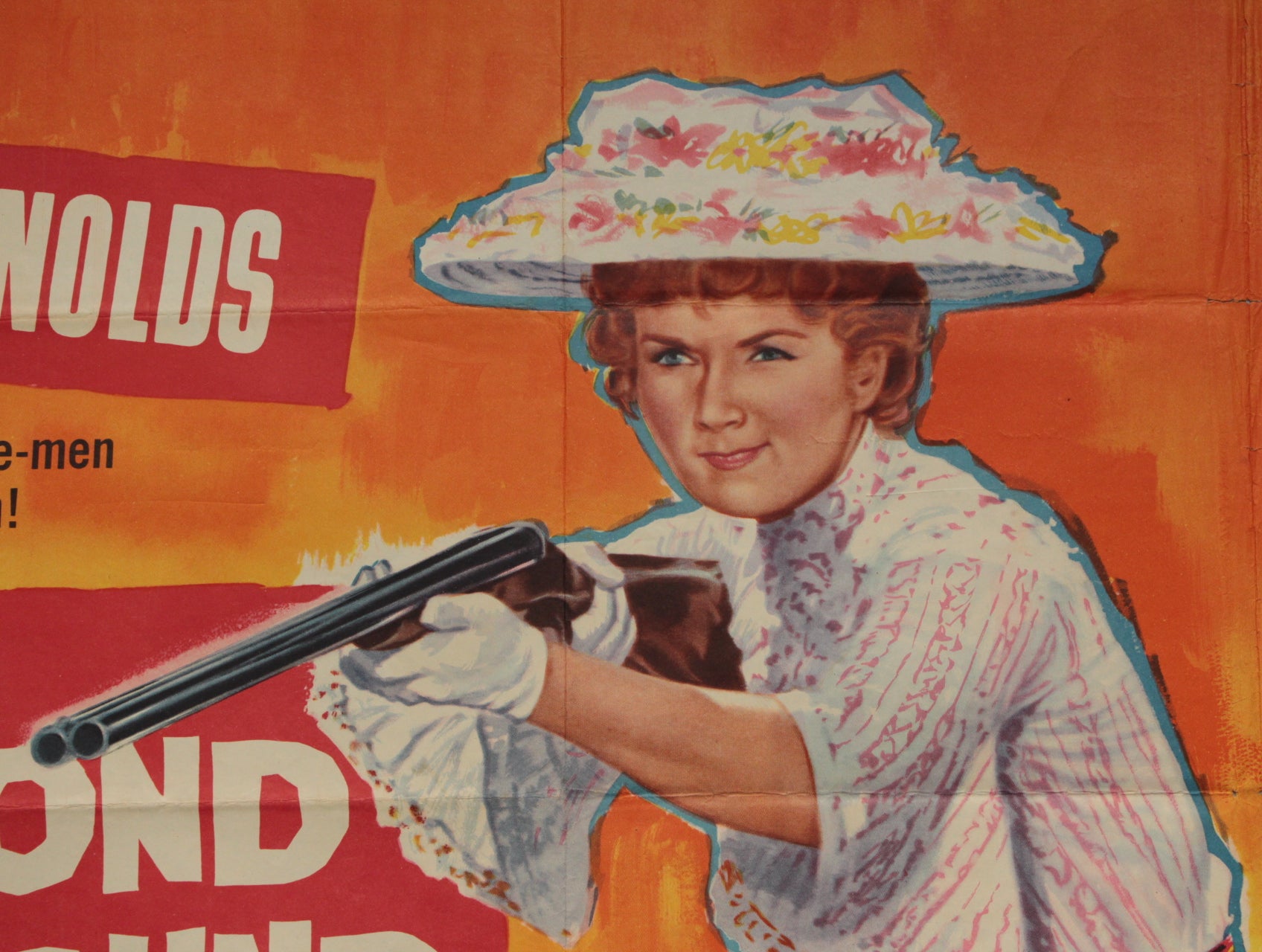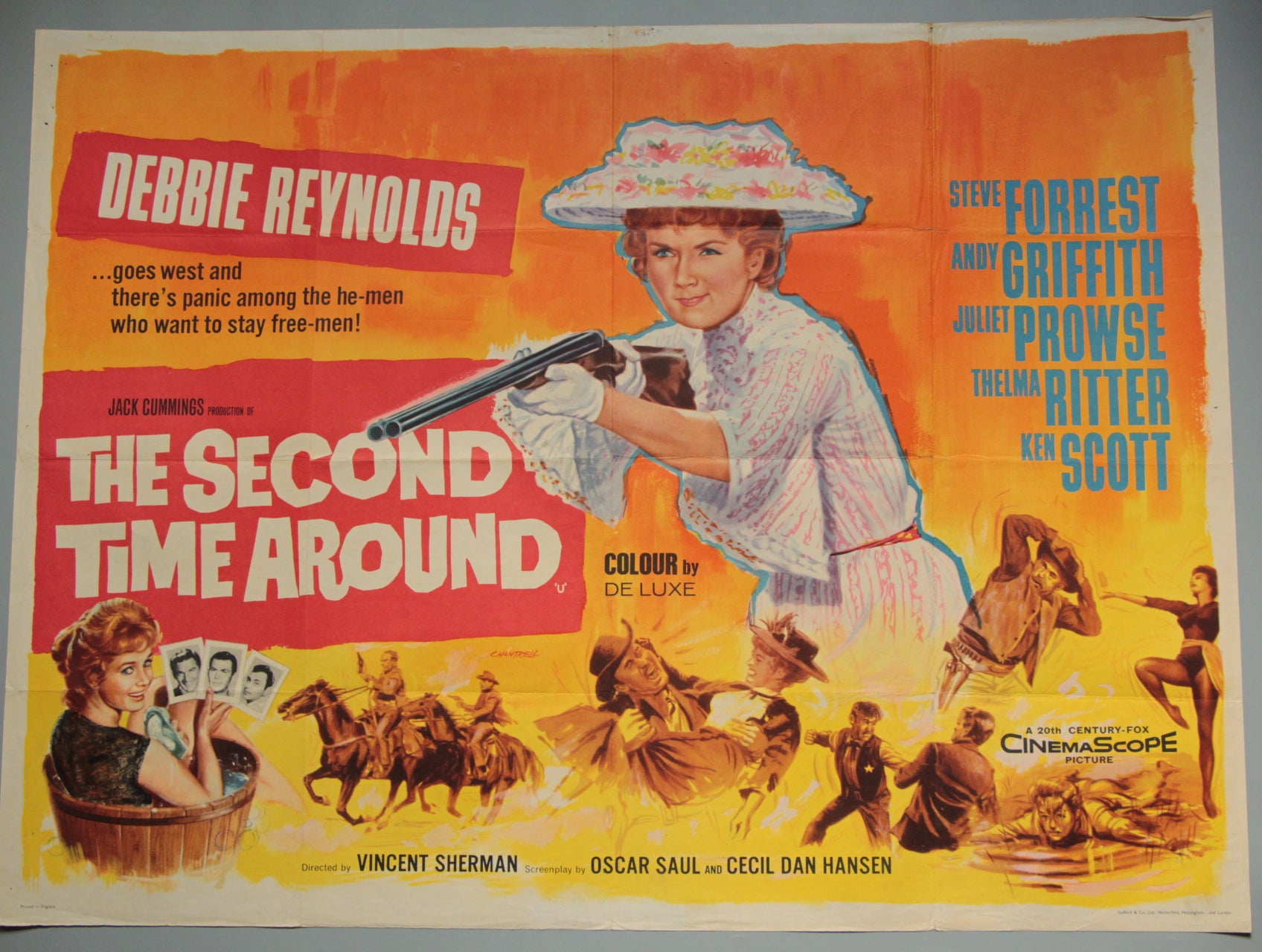 "The Second Time Around" original first release British quad film poster from 1961 picturing excellent portraits of Debbie Reynolds by British artist Tom Chantrell, with the artists signature printed on the poster above the cowboys on horseback. Printed in England by Stafford & Co. Ltd. Netherfield, Nottingham and London this folded film poster has a few pinholes in the borders, fold line tears along the right fold line and cross fold holes on the middle and right central crossfolds. Very bright colours, great comedy Western artwork from the "Carry on Cowboy" poster artist.
