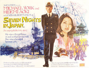 Beautiful film poster artwork blending in the formality of the Royal Navy with the Japanese natural setting. Arnaldo Putzu is the famous Italian artist who has painted Michael York as Prince George and Hidemi Aoki as Somi set against scenes of Japanese cherry blossom, the Navy and the warship. Printed by Lonsdale & Bartholomew of Nottingham with bright colours. In folded condition.