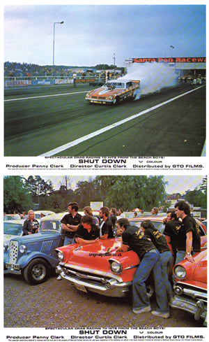 Vintage cars are pictured on these pair of original front of house cinema cards. Pictured are the drag racing cars for a film which included music by the Beach Boys.