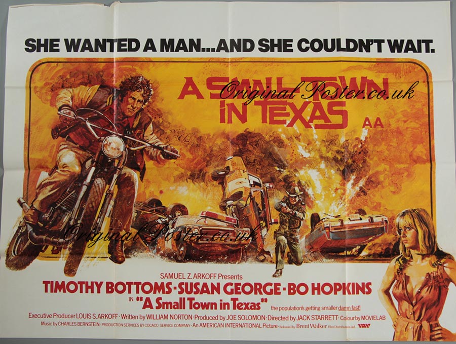 Timothy Bottoms is painted as the ex convict with a passion for motorbikes and car chases. Susan George plays the part of his good for nothing girlfriend. This first release film poster from 1976 features the printed signature of the British artist "Bysouth". Edge wear and slight paper loss at the top border which would easily frame out.