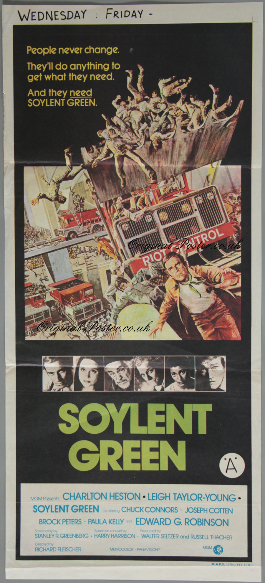 Crowded futuristic city of the future with Heston illustrated as the lone honest cop. There is no mistaking that Heston is the star of this film - but can one man make a difference faced with corporate irresponsability on a grand scale? Great poster , great film and a pleasure to see the wonderful Edward G in his last role. This litho printed Australian day bill film poster was purchased by us directly from a New Zealand cinema and it is in good folded condition with no pinholes. The cinema manager has written the certificate in a circle as seen plus the show dates in the top border.