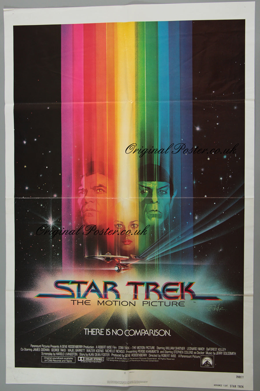 Superb first release advance one sheet film poster from 1979 for "Star Trek The Motion Picture". Superb rainbow effect colouring with incredible title typography litho printed in the USA. The printed signature of the artist Bob Peak appears on the film poster under the title. Excellent folded condition with no pinholes we purchased this one directly from a New Zealand cinema.