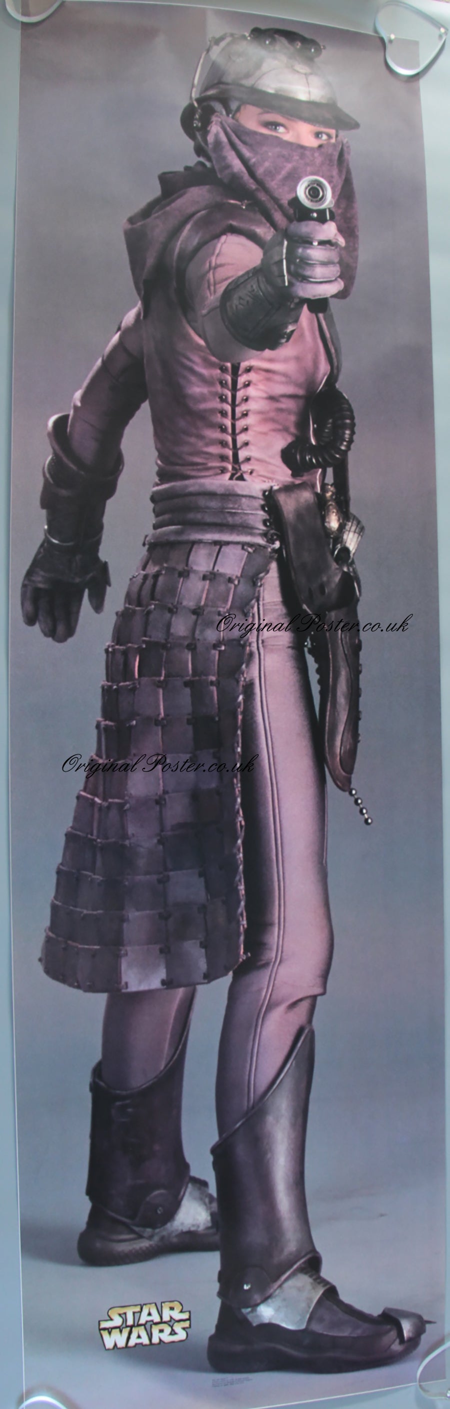 Full length Star Wars rolled condition door panel poster picturing Zam Wesell the shape-shifted hired assassin from 2002 produced by Advanced Graphics.