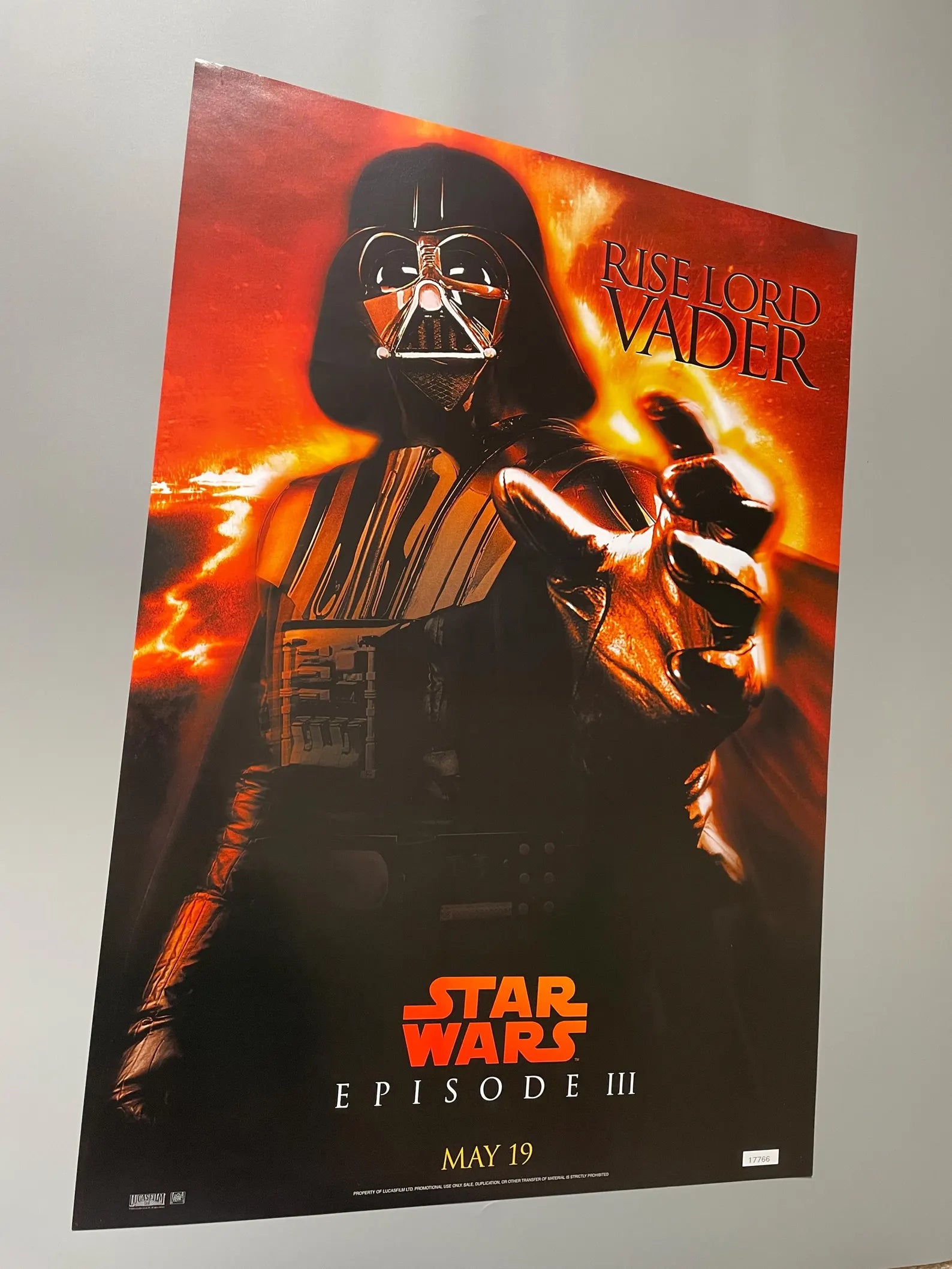 Rolled numbered advertising poster for "Star Wars: Episode III - Revenge of the Sith" featuring the Dark Lord Darth Vader with the menacing tag line "Rise Lord Vader". This poster was printed in a limited number and the edition number is printed in the bottom right corner and may vary.