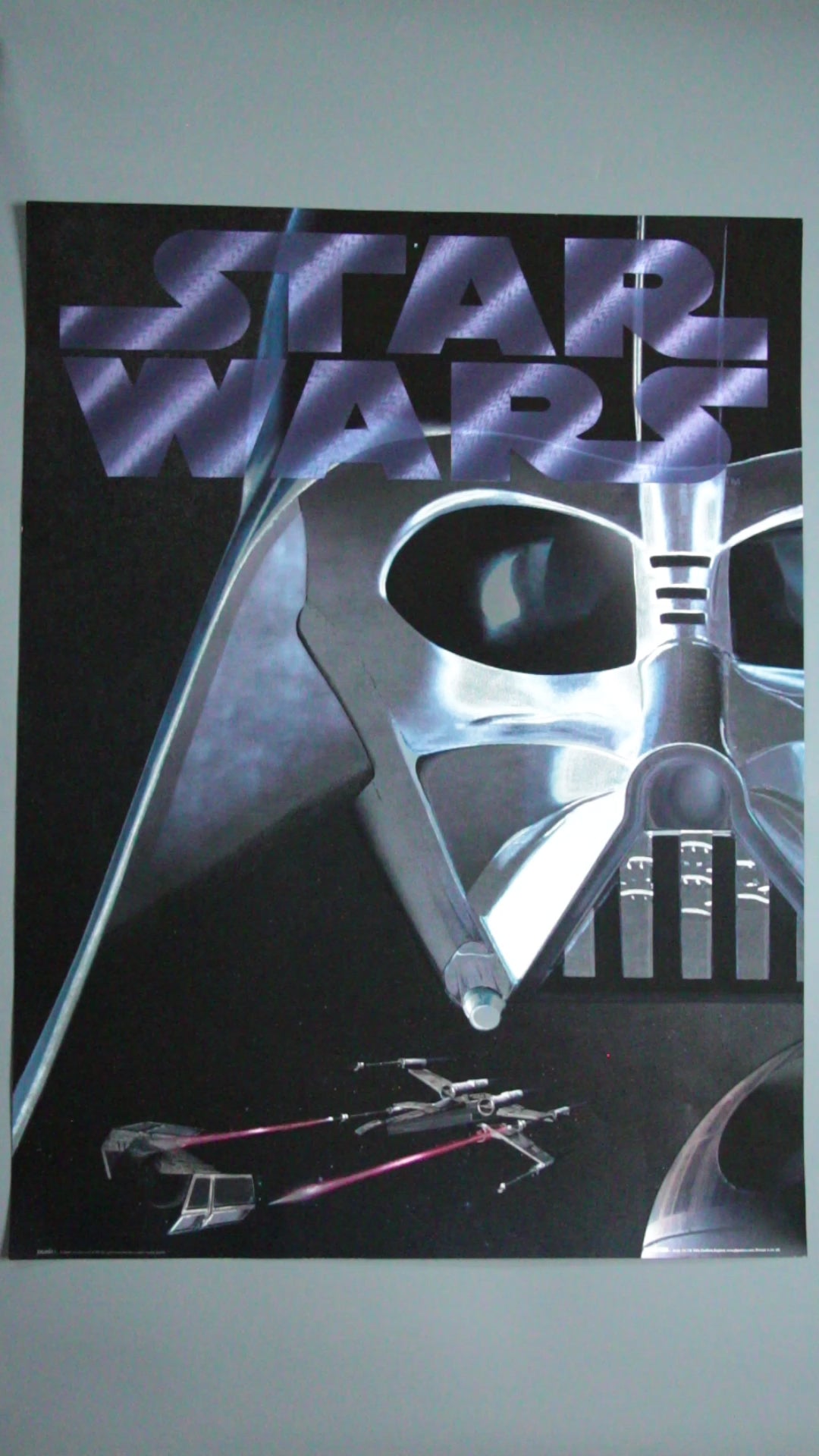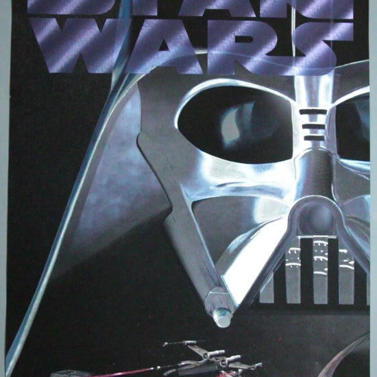 This spectacular holofoil "Star Wars A New Hope" film poster for the first Star Wars film made in 1977 really needs to be seen in the flesh to do it justice as the 3-D effects really only then become apparent with the impressive imposing figure of Darth Vader looming large over the galaxy and overseeing the TIE Fighter battling the X Wing for supremacy of the skies. We really love the silvery blue metallic effects and the flashes of colour as the battle rages at the foot of the poster. The lilac coloured title typography continues with glistening embellishment through to the Darth Vader helmet features and this is a truly great Star Wars film poster on thicker card and having been printed in 2004 under authorisation from Lucasfilm by GB Posters of Sheffield, England. The poster is unfolded and will be sent rolled in a sturdy tube. When the poster catches different lights the different colours effects and stars really take on a life of their own.