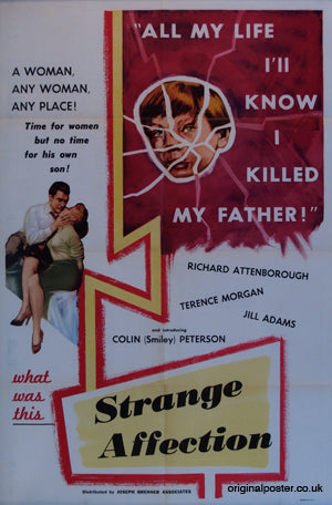 This 1957 film poster for the British film "Strange Affection" has Richard Attenborough as a British school master adopting a son played by Colin Peterson. Printed in the USA this film poster is in folded condition as supplied to the cinema. Reinforcement with tape at the centre folds and writing the back which doesn't show through.
