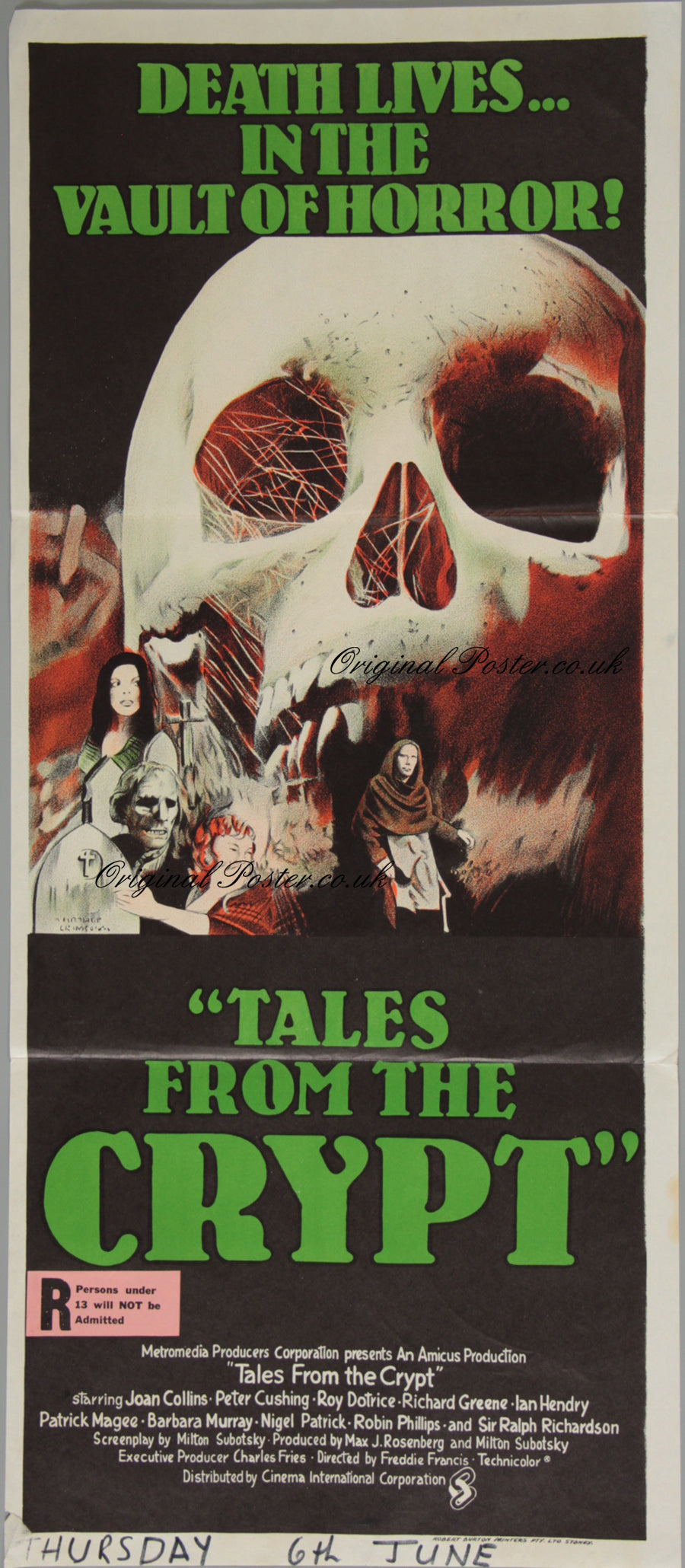 This 1972 first release film poster "Tales from the Crypt" has great stone litho printing from Robert Burton of Sydney. Freddie Francis directs as Peter Cushing returns from the grave, Patrick Magee is a victimised blindman while Joan Collins battles a deranged Santa Claus. Super film poster direct to us from a New Zealand cinema folded with no pinholes and black felt showtimes at the foot.